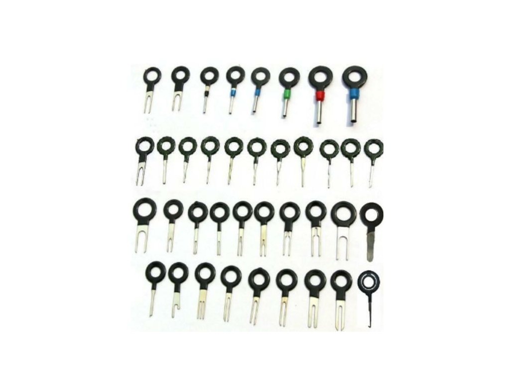 Univerzální sada 38 kusů vytahovačů pinů pro demontáž pinů (spojek). Sada se skládá ze 4 typů klíčů (jednoduchý, dvojitý, trubkový a trojitý) s různými průměry. Jsou perfektní pro opravy elektrických a instalačních kostek. Povinná výbava pro všechny osoby zabývající se opravami autoelektriky nebo počítačového vybavení.
