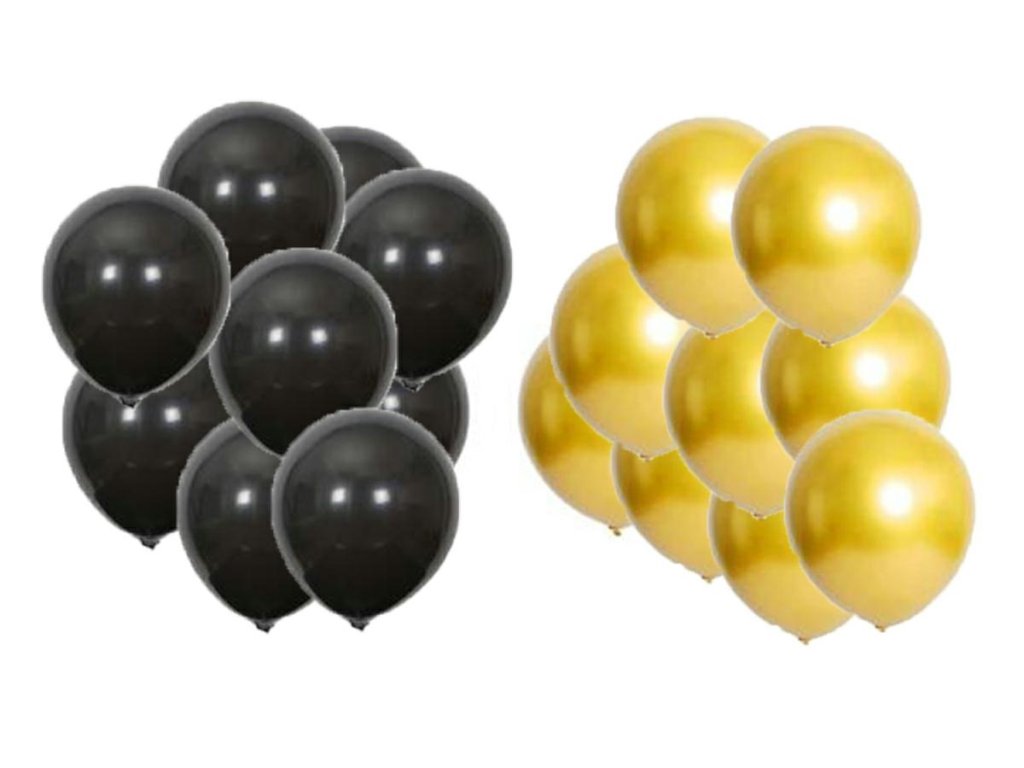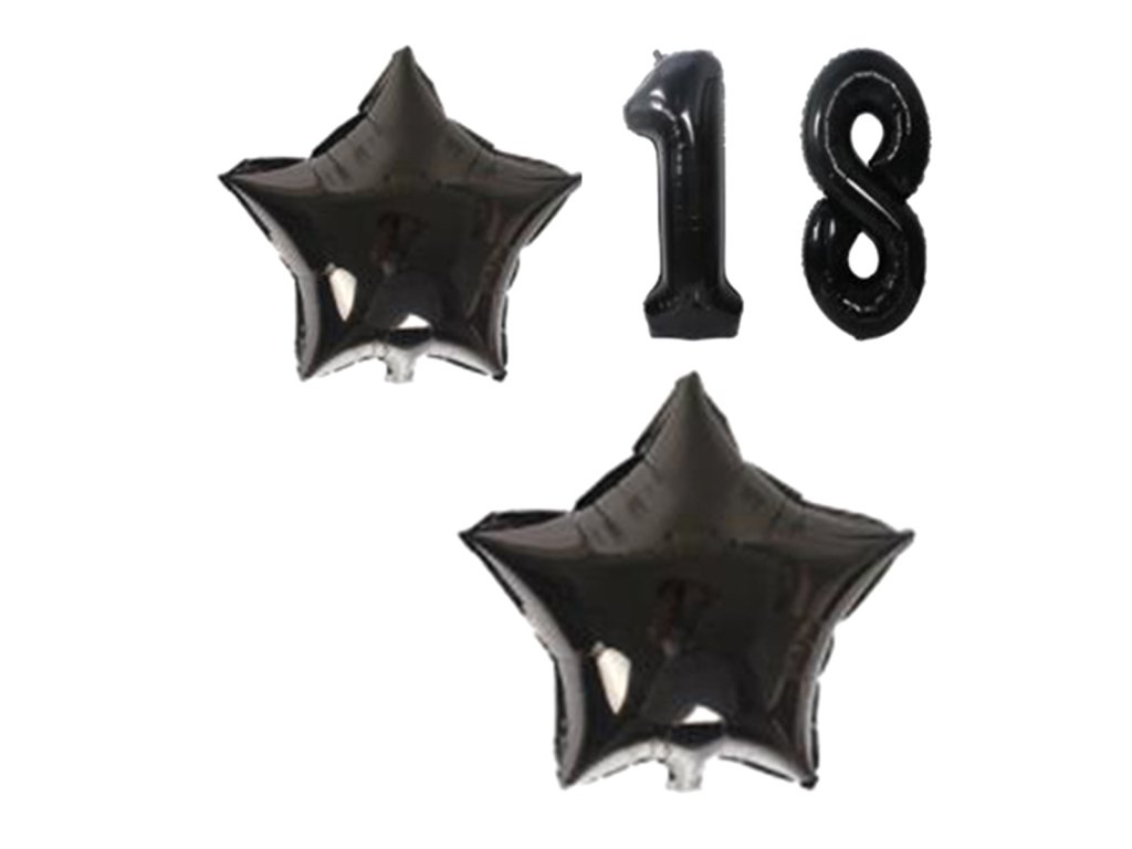 Sada balónků a dalších dekorací k 18. narozeninám. Jsou perfektní jako dekorace na oslavu 18. narozenin. Sada obsahuje 20 balónků (10 zlatých a 10 černých), dvě černé hvězdy, dva balónky s čísly 1 a 8 a transparent s nápisem "Happy Birthday".
