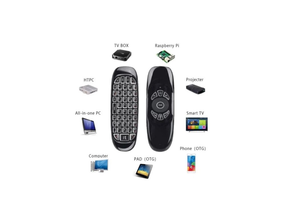 - Funkce: klávesnice QWERTY, prostorová myš (Air Mouse), multimediální tlačítka
