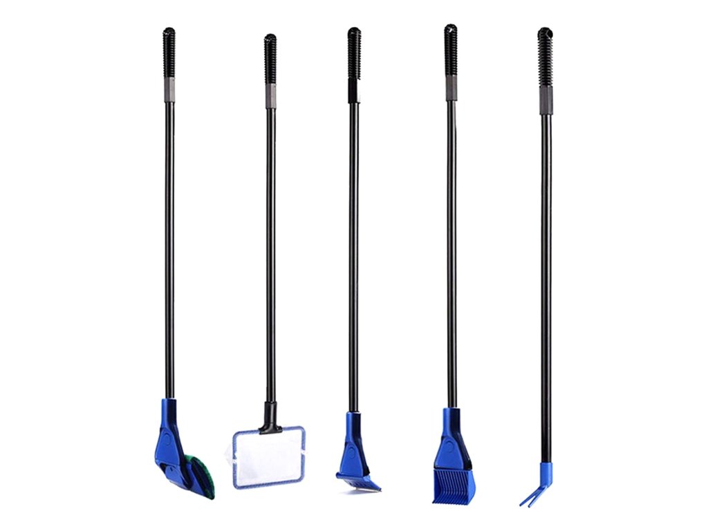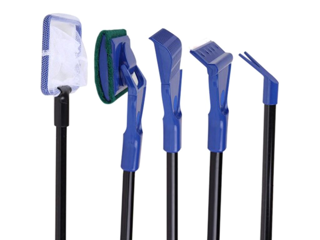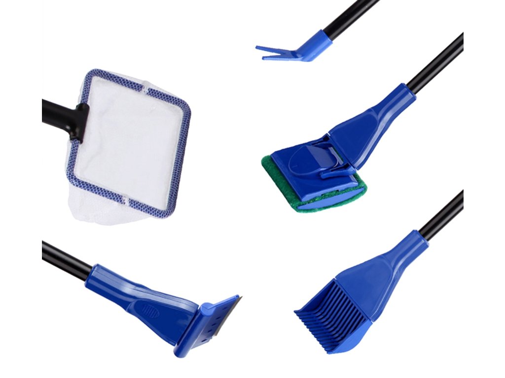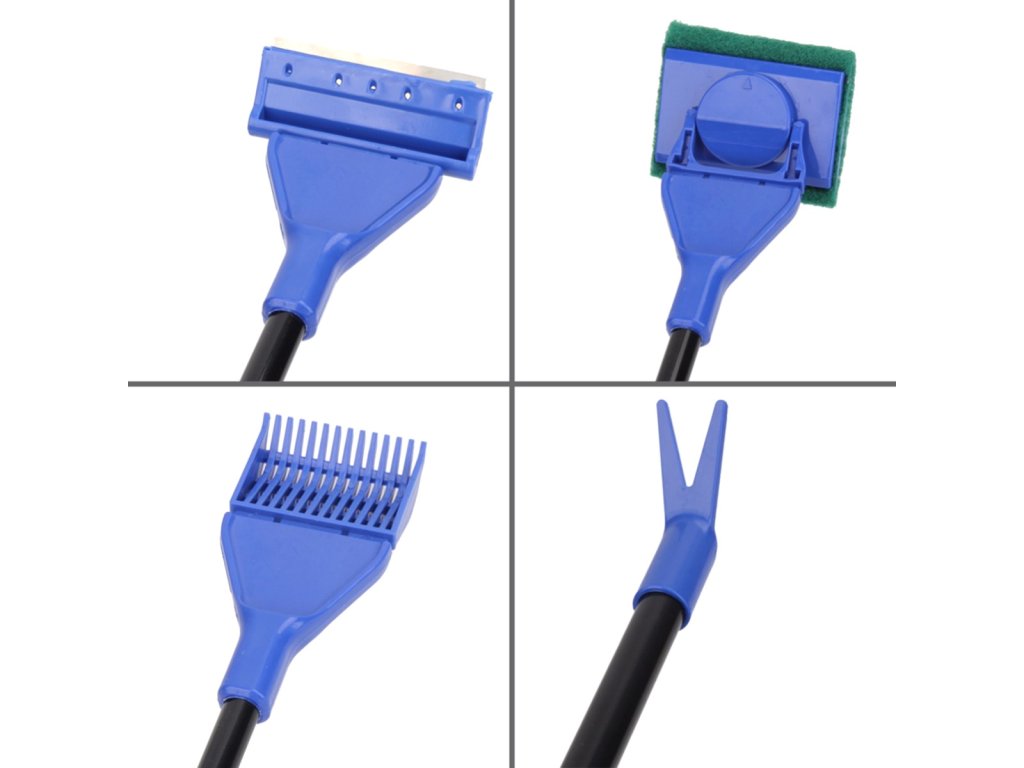 Funkční sada na čištění akvária. Čistič obsahuje až 5 vyměnitelných prvků, které výrazně usnadňují čištění akvária (síťka na ryby, skleněná houba, hrábě na štěrk, kleště na rostliny a škrabka na sklo). Vyrobeno z pevného plastu. Extrémně snadné použití (vyměnitelné hroty).