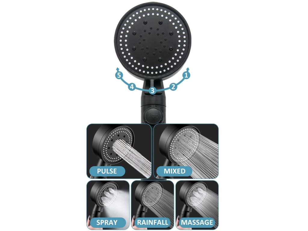 Stručný popis: Kompletní sada pro osvěžení vaší koupelny. Obsahuje moderní černou sprchovou hlavici s 5 režimy a funkcí STOP, flexibilní sprchovou hadici a nástěnný držák. Hlavice je navržena pro úsporu vody při zachování silného proudu.
