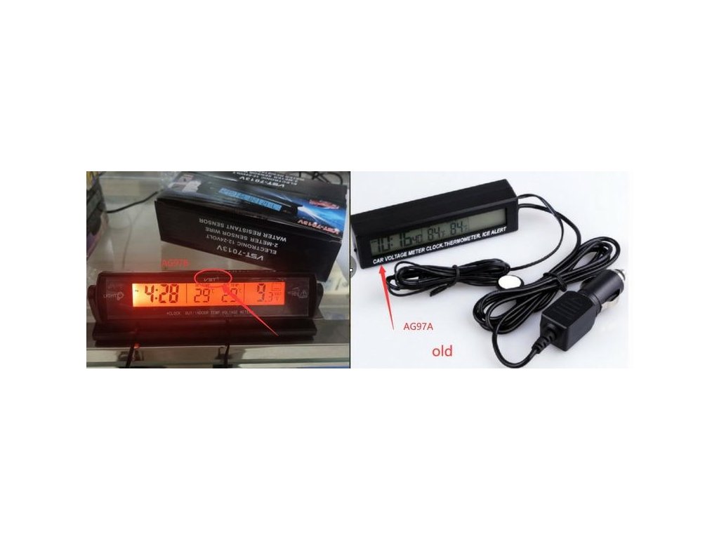 Elektronický teploměr do auta s hodinkami a měření úrovně nabití baterie. Teploměr má velký, přehledný LCD displej s podsvícením (napájený z 12V zásuvky autozapalovače), který současně zobrazuje teplotu ze dvou senzorů, čas a napětí baterie. Dlouhý kabel s voděodolným čidlem vnější teploty umožňuje umístění čidla pod přední nárazník, což zaručuje nejlepší měření vnější teploty za jízdy i ve stoje. Možnost změny formátu zobrazení času (12 nebo 24) a jednotky teploty (C / F). Sada obsahuje silnou oboustrannou lepicí pásku umožňující snadné připevnění teploměru na čalounění auta.