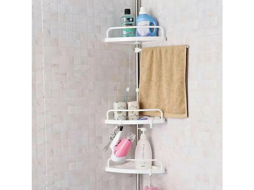 Pohodlná, teleskopická koupelnová polička s nastavitelnou výškou. Vybaveno 4 trojúhelníkovými policemi a přemístitelným věšákem na ručníky. Dodatečné, odnímatelné háčky na ručníky. Polička je chytrý způsob, jak ušetřit místo v koupelně. Promyšlený design zabraňuje hromadění vody. Kryt na přední straně každé police zabraňuje náhodnému pádu kosmetiky. Pevná a neinvazivní instalace pomocí expanzního dalekohledu s nastavitelnou délkou. Je perfektní jako způsob, jak pohodlně uložit kosmetiku a koupelnové doplňky.