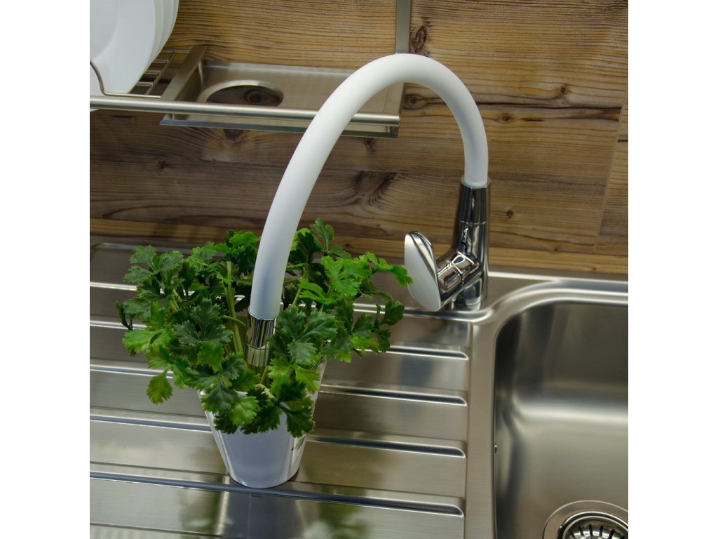 Vodovodní baterie dřezová stojánková s flexibilním otočným ramínkem s dvoupolohovým perlátorem (funkce proud/sprcha).