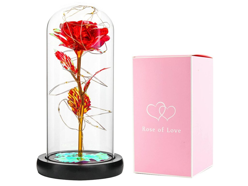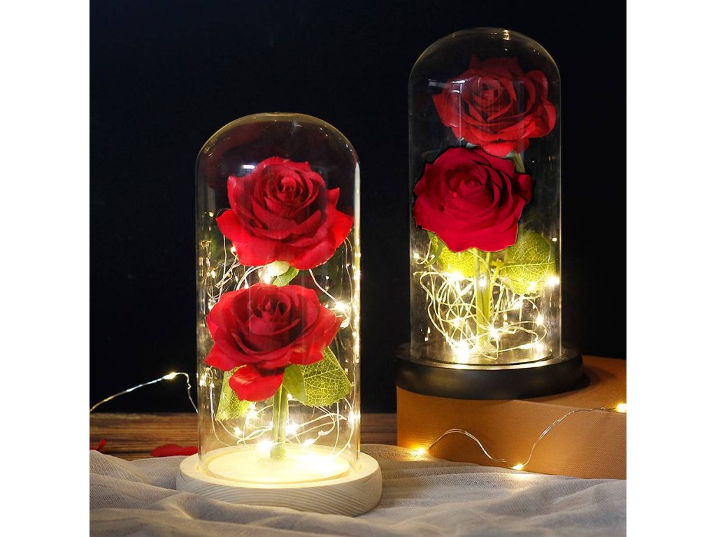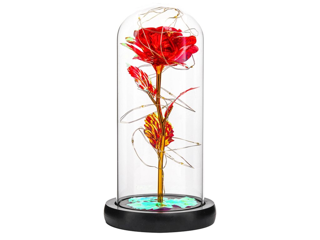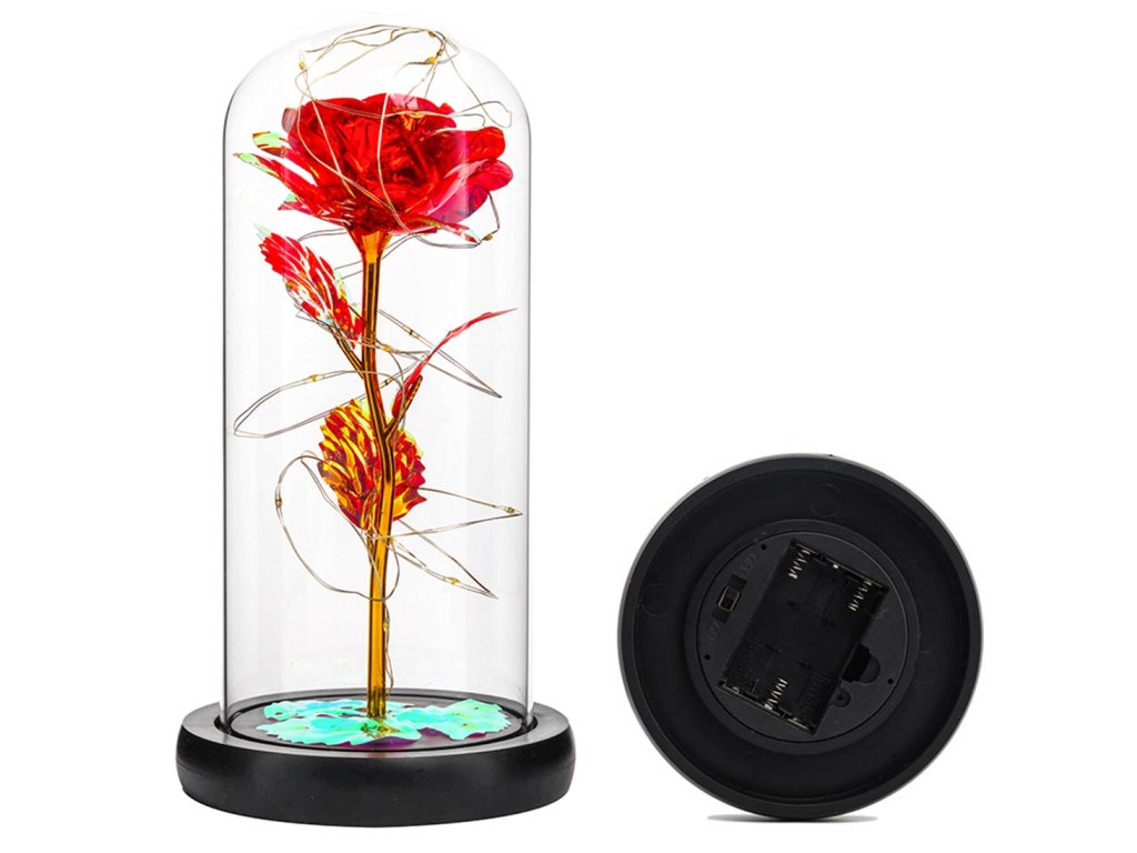 Věčná růže v elegantním skleněném stínítku. Díky barevnému RGB LED podsvícení zůstane růže zářivá a okouzlující i ve večerních hodinách. Dodávána je v luxusní dárkové krabičce, což z ní činí ideální dárek na Valentýna, narozeniny nebo jako neobvyklé překvapení pro milovanou osobu.