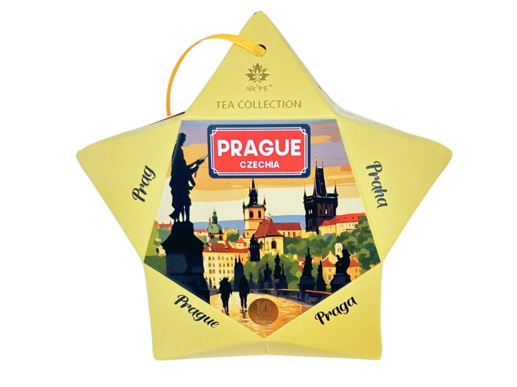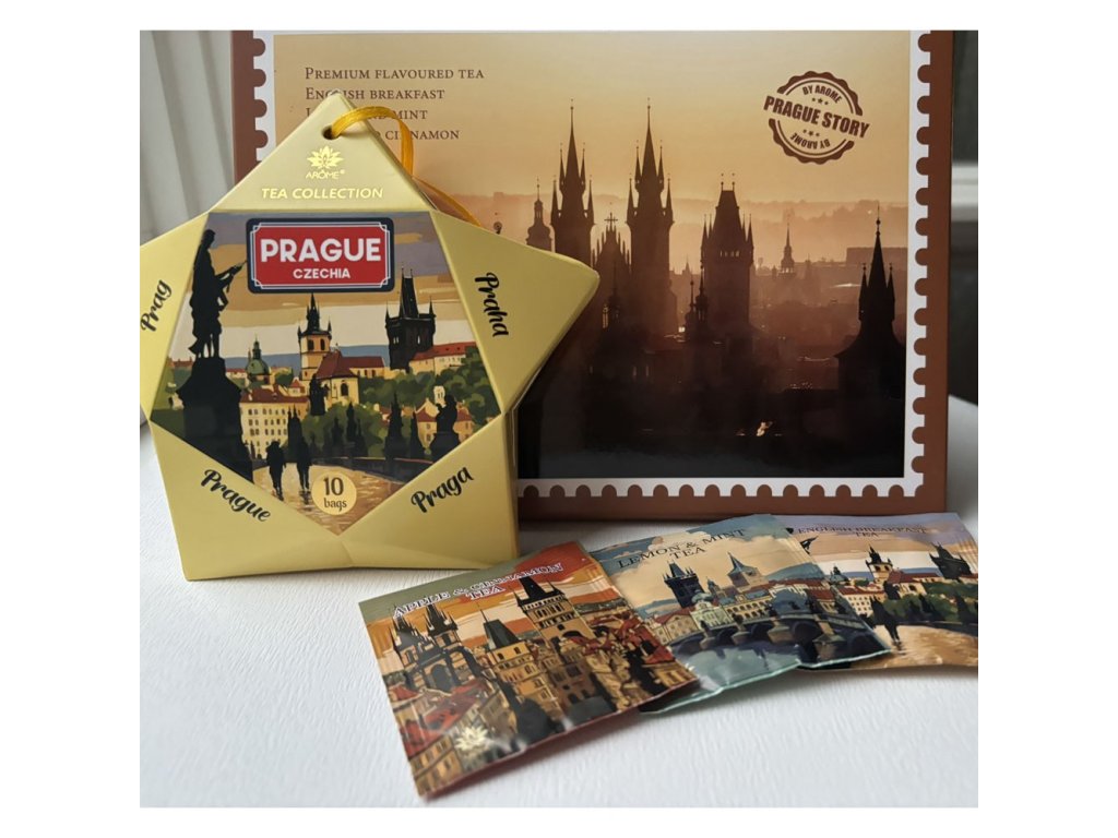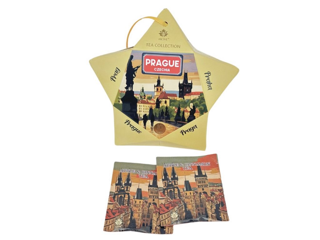 10 kusů sáčků černého čaje ze Srí Lanky s příchutí jablka a skořice je baleno v dárkové krabičce ve tvaru hvězdy zdobené krásnými obrázky historické Prahy.
