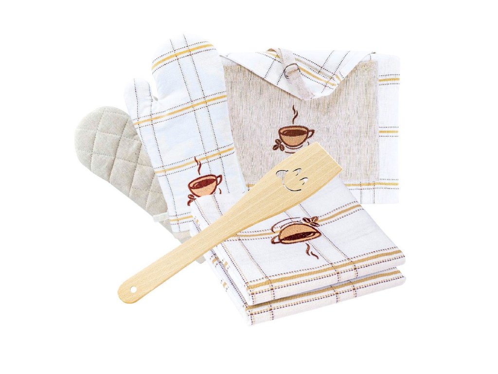 ARÔME HOME Dárkový kuchyňský set Káva - zástěra, chňapka,útěrky a dřevěná vařečka