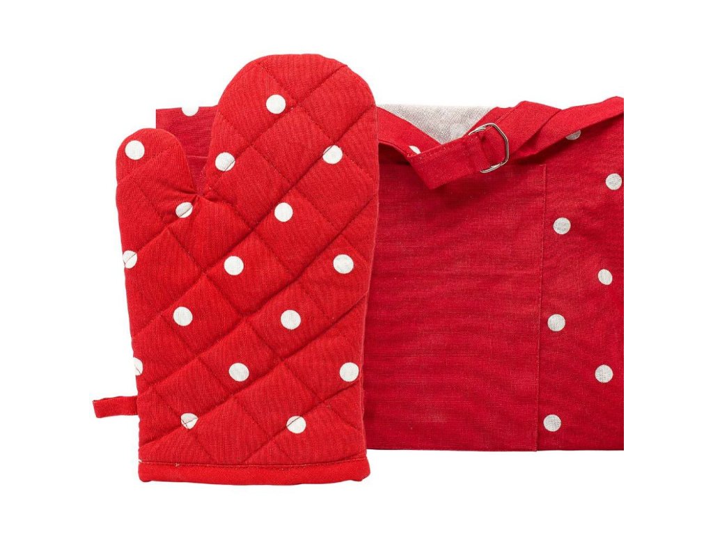 Červená prošívaná kuchyňská chňapka s magnetem a poutkem je zdobená puntíky. Chňapka je nepostradatelná při vaření, pečení nebo třeba grilování.