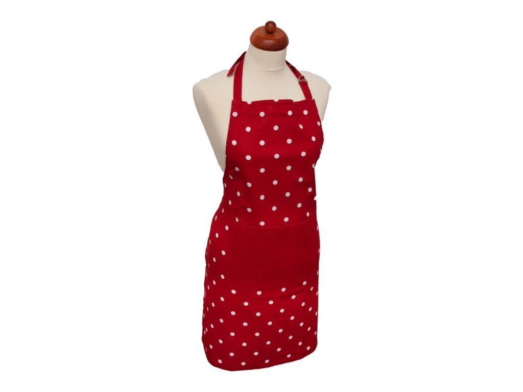 Červená zástěra s bílými puntíky přijde vhod každé kuchařce nebo i kuchaři. Zástěra má funkční kapsu a libovolné zavazování v pase.