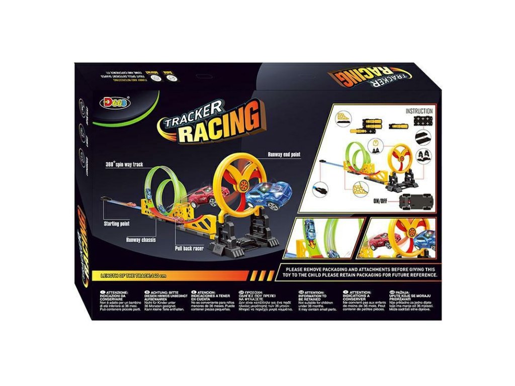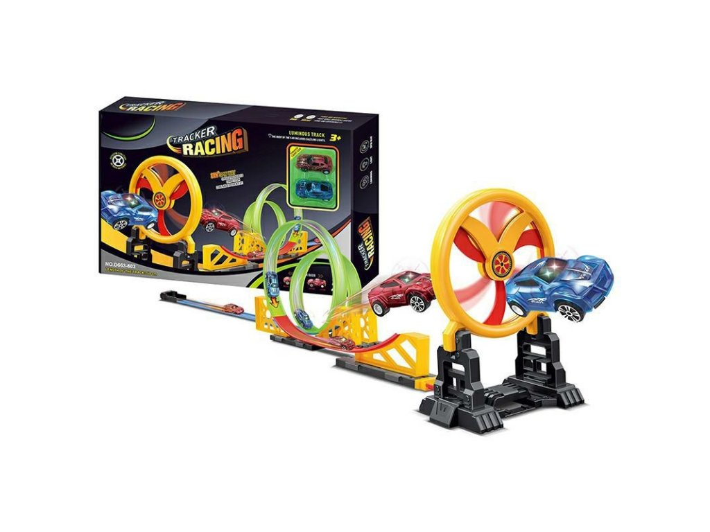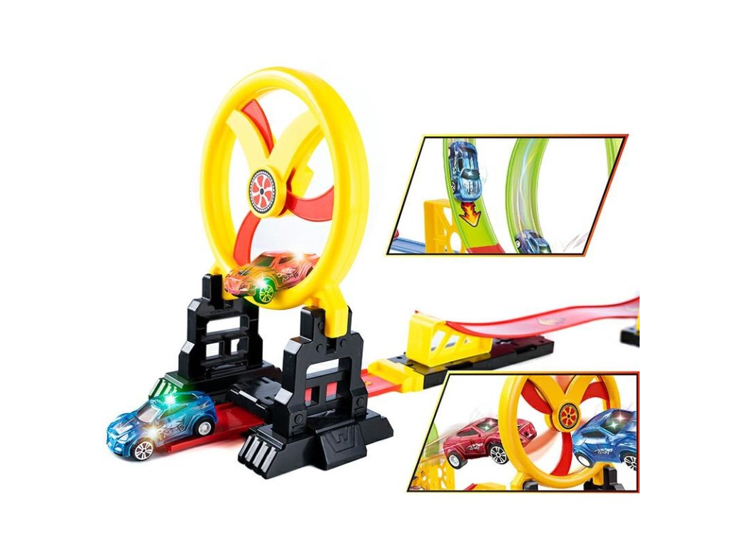 Závodní dráha s překážkou, kterou si můžete sestavit sami. Na konci překážky je rotující mlýn, který ztěžuje průjezd pružin. Specifikace: Tato dráha, kterou si můžete sestavit sami, má celkovou délku 140 cm. Dráha obsahuje dvě spirály, které umožňují pružině otáčet se během jízdy o 360 stupňů. Pružiny a mlýn jsou poháněny pružinami, takže k provozu nevyžadují žádnou energii. Dvě auta s barevným osvětlením (napájení pro osvětlení 1 auta: 3x baterie AG3/LR41 součástí balení). Rozměry balení: 46x30x6cm. Tato hračka je vhodná pro děti starší 3 let. Počet kusů na paletě: 192.