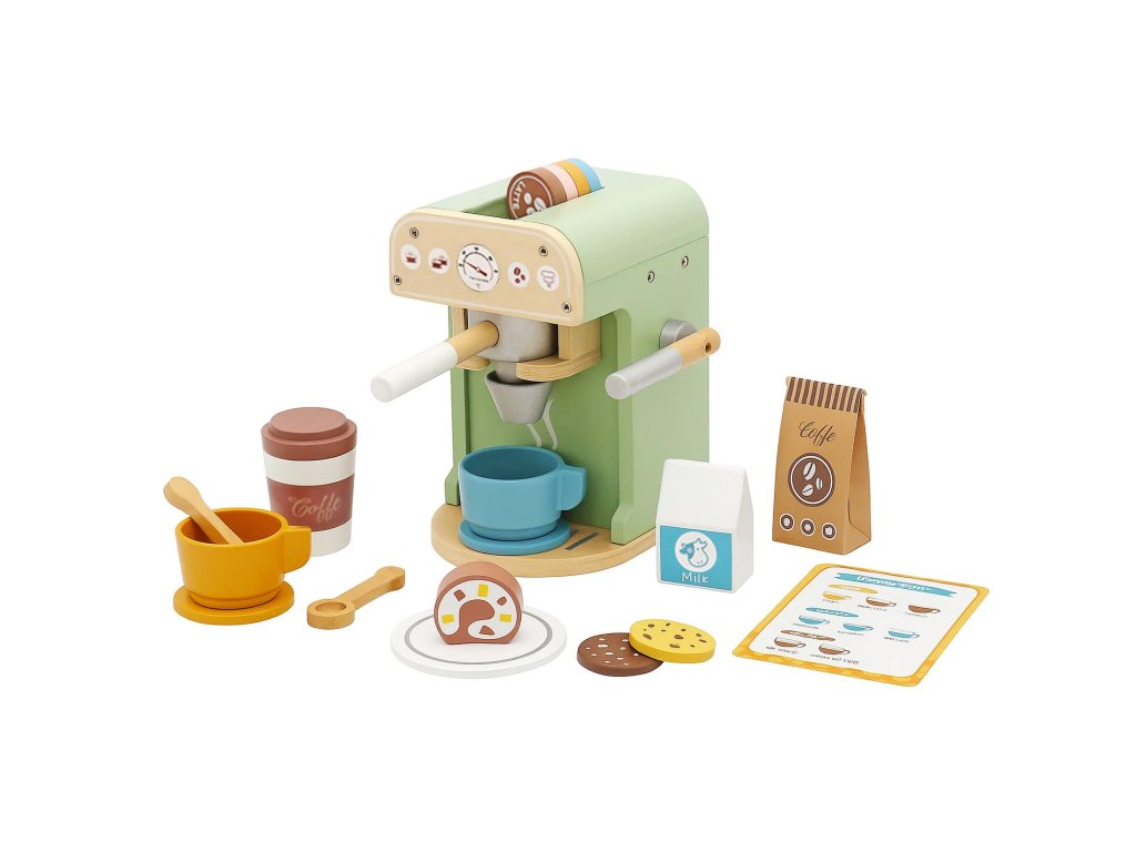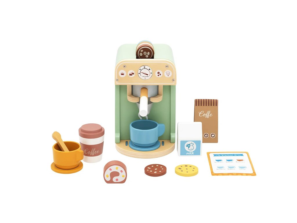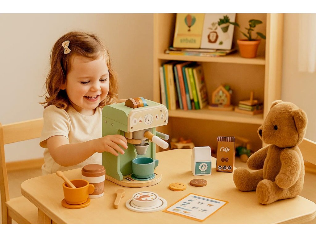 Tato dřevěná hrací sada s motivem kavárny je okouzlující hračka, která rozvíjí dětskou fantazii a kreativitu. Sada obsahuje kávovar, hrnky, příslušenství a simulované produkty, které dětem umožňují hrát si na baristy. Bezpečné, barevné dřevěné prvky jsou odolné a esteticky příjemné – ideální pro hraní doma nebo ve školce. Rozměry: 20x12x14cm
