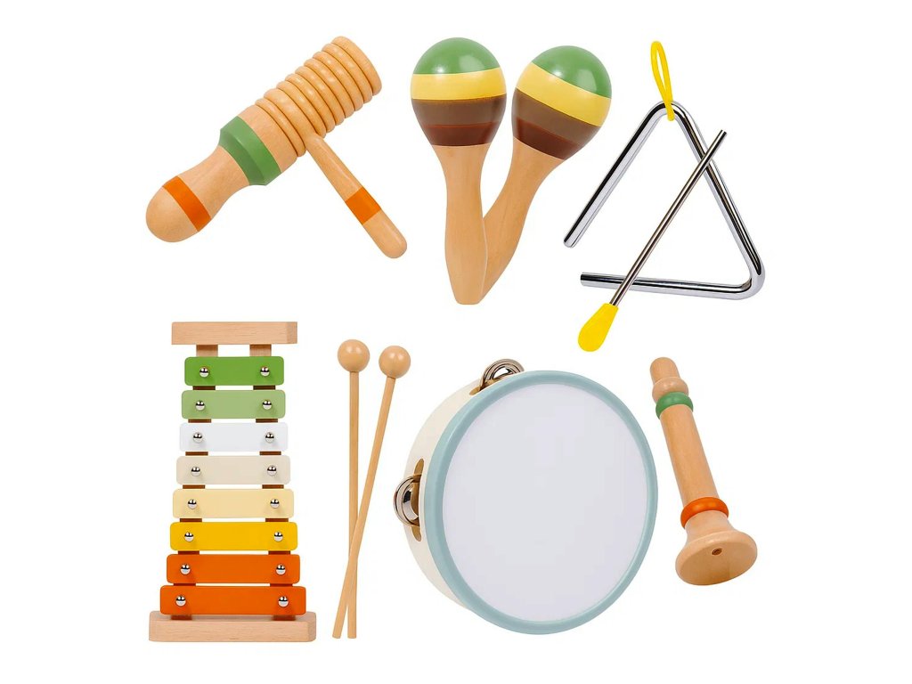 Tato sada dřevěných hudebních nástrojů pro děti je ideální pro malé zvukové objevitele. Sada obsahuje xylofon, tamburínu, triangl a další bicí příslušenství, které rozvíjí sluch, rytmus a koordinaci. Esteticky příjemná sada povzbuzuje ke hře a tvorbě hudby. Rozměry: 24,5 x 16 x 7,10,3 cm