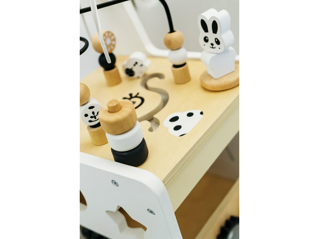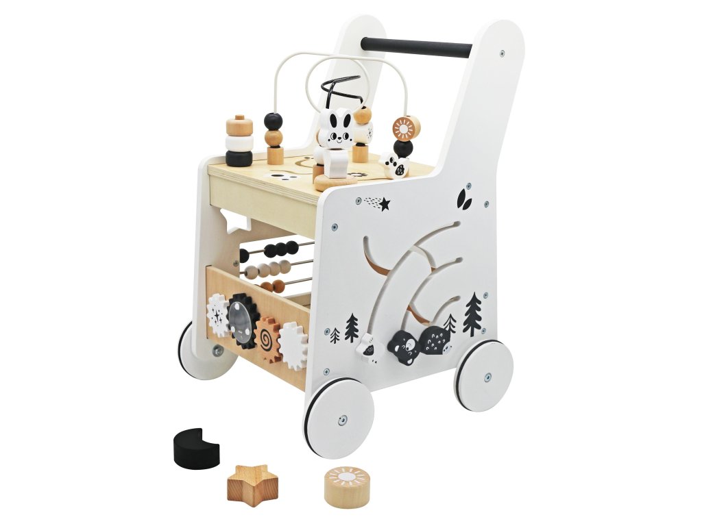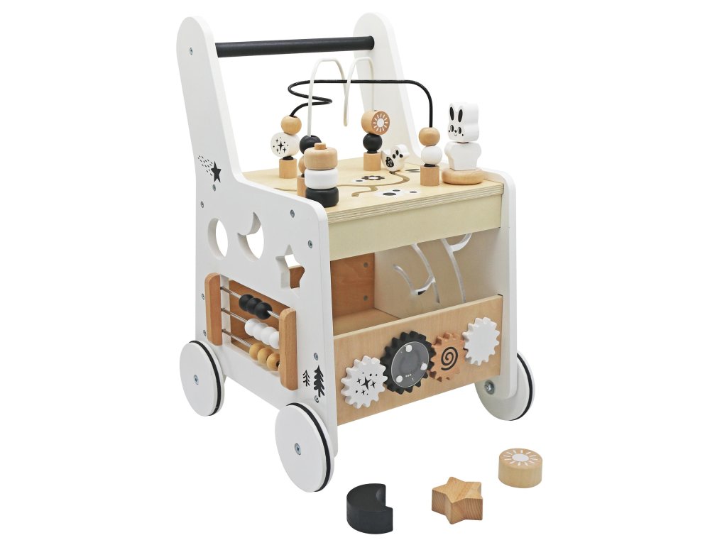 Toto dřevěné edukativní chodítko je multifunkční hračka, která podporuje rozvoj motorických dovedností, rovnováhy a koordinace u dětí. Je vybaveno třídičem, počítadlem, ozubenými koly, motorickou smyčkou a dalšími interaktivními prvky a zajišťuje dlouhou a poutavou hru. Jeho stabilní konstrukce a příjemné barvy z něj činí perfektního společníka pro první krůčky vašeho dítěte. Rozměry: 33x31x49,3 cm