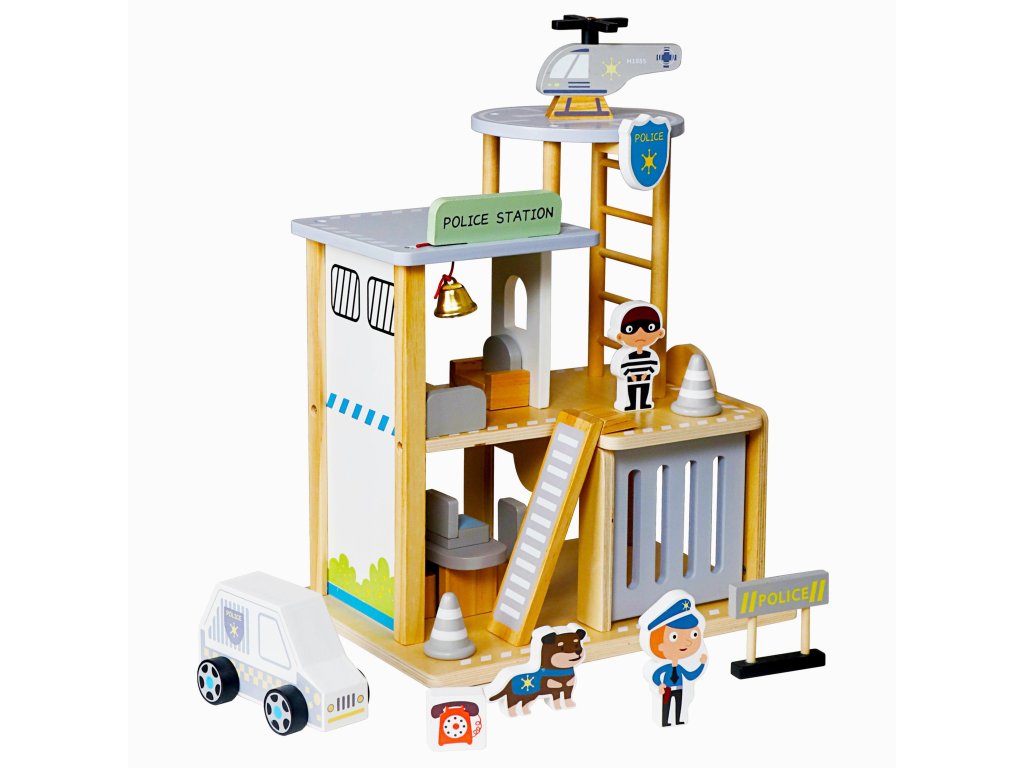 Tato dřevěná policejní stanice je dobrodružná hračka pro děti, které si rády vymýšlejí vlastní scénáře a záchranné akce. Sada obsahuje budovu policejní stanice, policejní auto, vrtulníky, figurky policistů a lupičů a další tematické doplňky. Pevná konstrukce a důraz na detail zajišťují hodiny kreativního hraní. Rozměry: 35x22x30cm