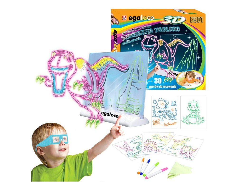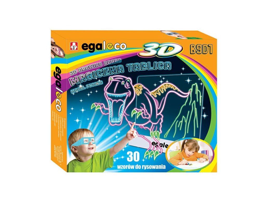 Kouzelný 3D kreslicí tablet/tabule. Stačí nakreslit obrázek, zapnout podsvícení, nasadit si přiložené brýle a každý obrázek získá 3D efekt! Je to skvělá zábava pro děti všech věkových kategorií. Kresby lze snadno setřít přiloženým hadříkem. Značka: Egaleco Specifikace: Napájení z baterií: 3xAA (nejsou součástí balení), LED podsvícená tabule, 4 barevné fixy, hadřík na otírání kreseb, 3D brýle, 15 oboustranných šablon (30 kreslicích vzorů různé obtížnosti), rozměry: 24,5x21x5,3cm. Vhodné pro děti starší 3 let. Množství v krabici: 288