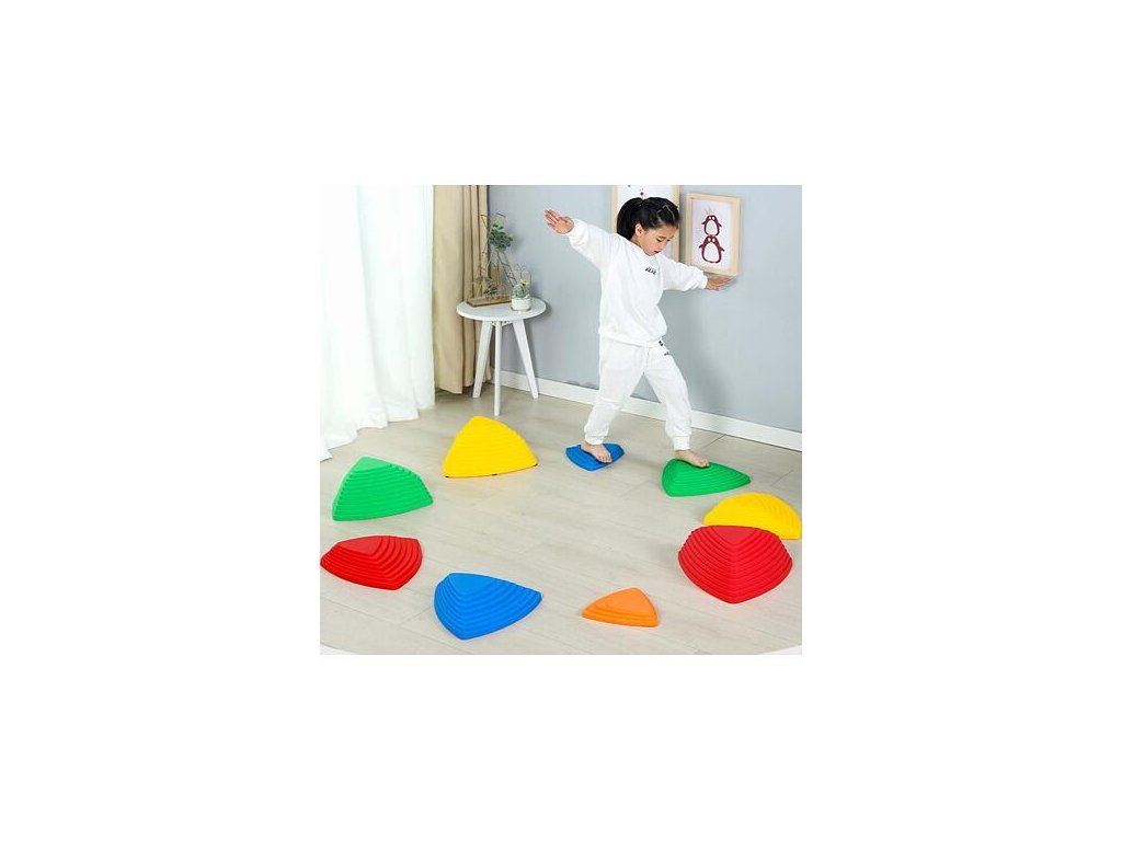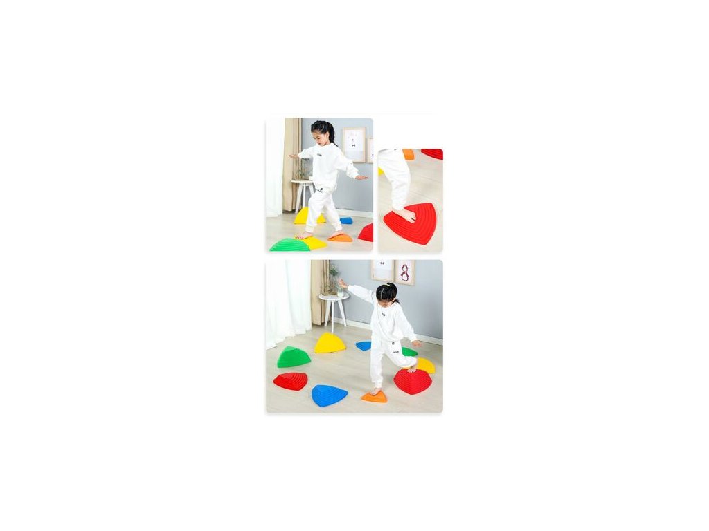 Sada Balance Stepping Stones tvořená 11 plastovými nášlapnými bloky-kameny ve tvaru trojúhelníku umožňuje sestavit zábavnou dráhu pro děti, které si na ní formou hry mohou trénovat své koordinační dovednosti, rovnováhu a prostorovou orientaci. Kameny ve čtyřech velikostech a pěti barvách jsou opatřené protiskluzovými podložkami, které zajišťují jejich stabilitu. Ať si už děti budou hrát na přecházení rozvodněné řeky, překonávání různých překážek, nebo prostě jen tak šlapat z kamene na kámen, užijí si se sadou balančních kamenů Balance Stepping Stones 11 spoustu zábavy. Ideální pomůcka pro školky, školy nebo zájmové kroužky. Kombinovat ji můžete s Balance Bridge 884 motorickou dráhou. - maximální nosnost 1 kamene: 50 kg - materiál: plast PE - nevhodné pro děti do 3 let. Vždy používejte pod dohledem dospělé, zodpovědné osoby! Obsah balení: - 2 extra velké kameny (rozměr 1 kusu: 40x40x40 cm, výška 20 cm, hmotnost 700 g) - 2 velké kameny (rozměr 1 kusu: 38x38x38 cm, výška 16 cm, hmotnost 550 g) - 3 střední kameny (rozměr 1 kusu: 35x35x35 cm, výška 8 cm, hmotnost 400g) - 4 malé kameny (rozměr 1 kusu: 24x24x24 cm, výška 4,5 cm, hmotnost 160 g) - 66 protiskluzových podložek v samostatném balení
