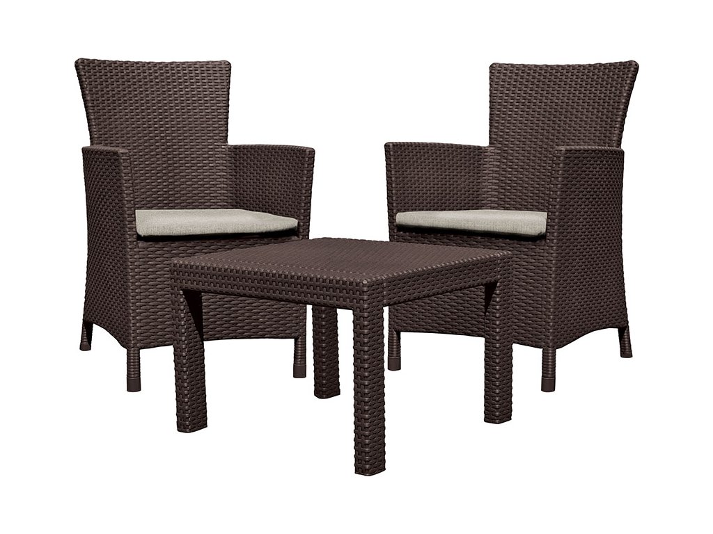 Komfortní komplet zahradního nábytku z vysoce kvalitního plastu v imitaci přírodního ratanu. Pohodlná křesla s vysokou opěrkou jsou doplněna stylovým kávovým stolkem. Křesla jsou doplněna měkkými polstrovanými sedáky. Sestava je pro své rozměry vhodná na balkóny nebo menší terasy.