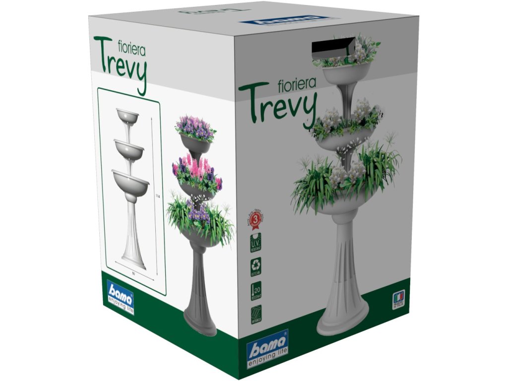 Květináč TREVY je složený ze tří misek o průměru 30, 40 a 50 cm spojených sadou průhledných opěr a s nosným sloupem. Květináč TREVY umožnuje vytvořit květinové kaskády s velkým estetickým účinkem. Ideální pro vnitřní i venkovní prostory.