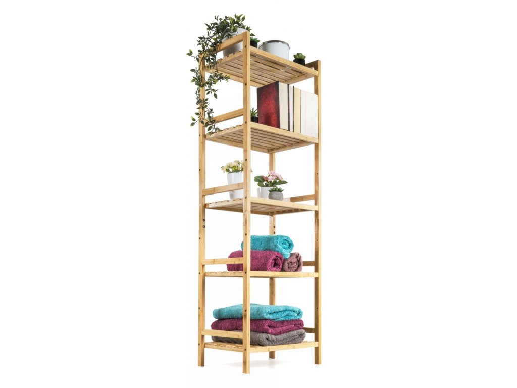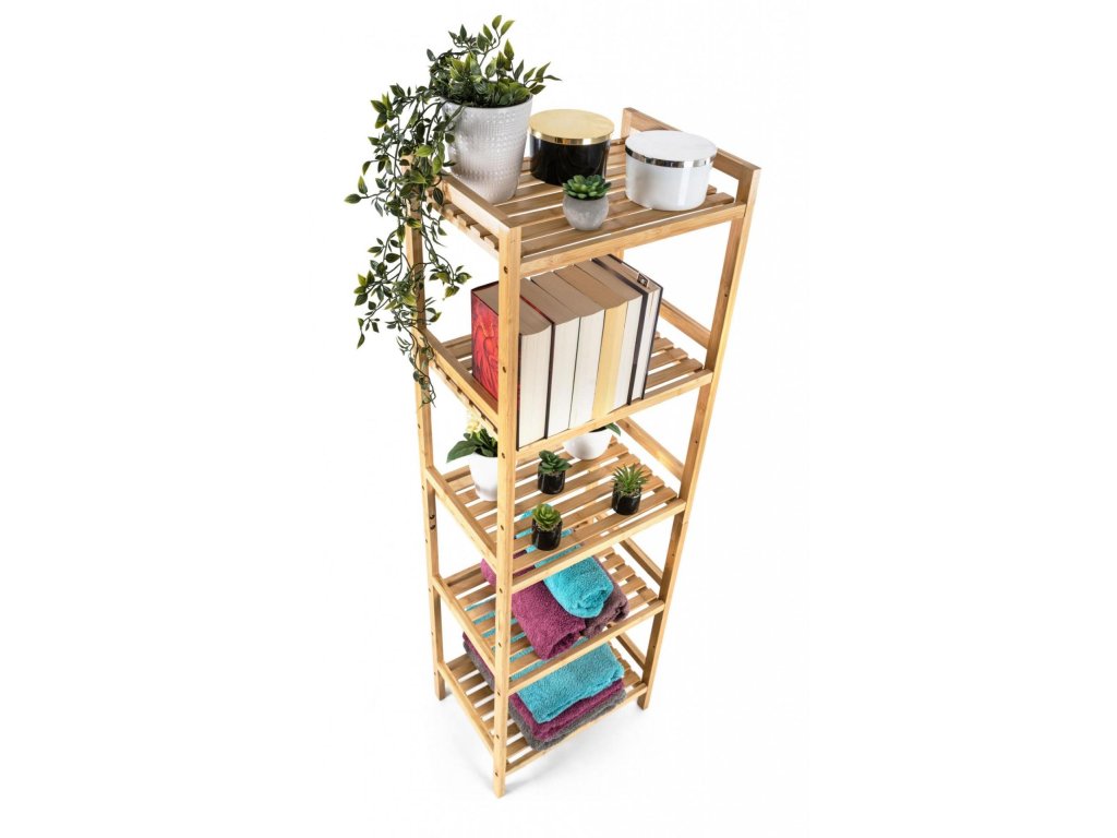 Bambusový regál s pěti policemi dodává interiéru příjemný přírodní dojem, pocit lehkosti a přirozenosti, zatímco jeho pevnost a dlouhá životnost zajišťují stabilitu a trvanlivost.