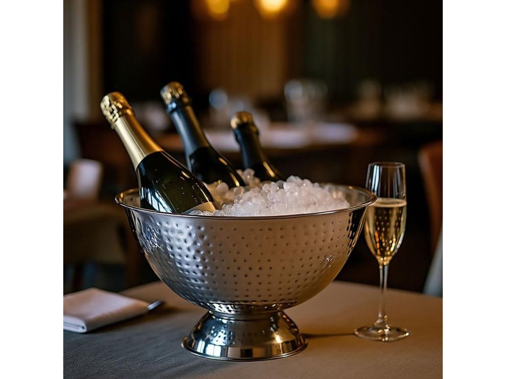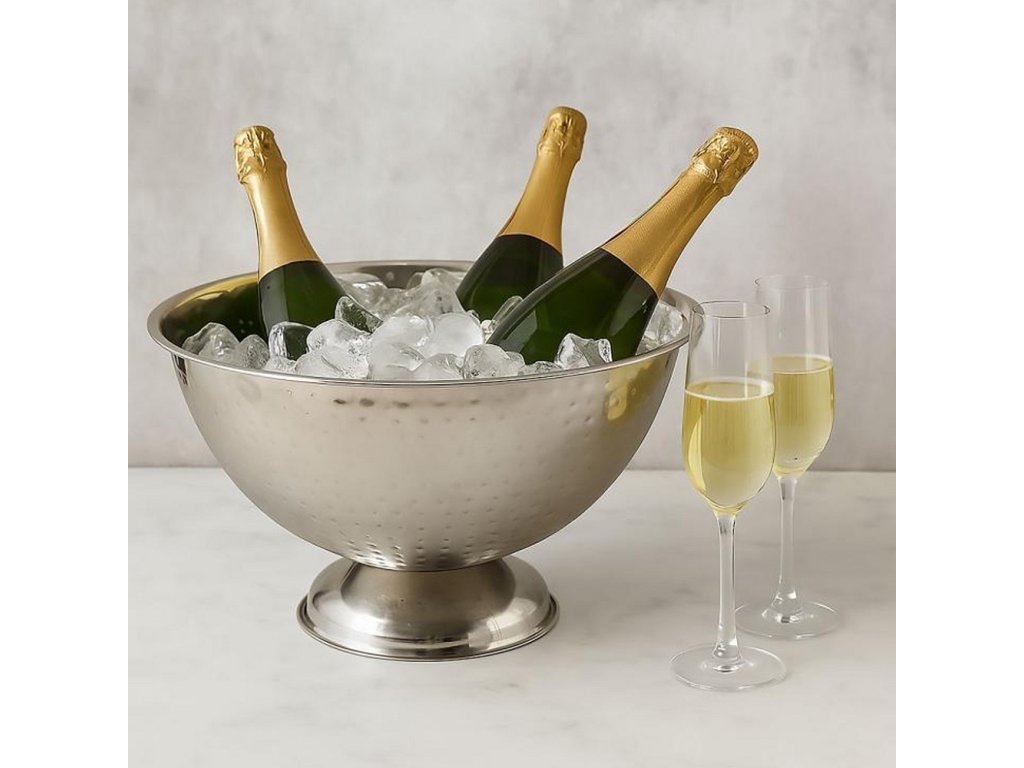 Nádoba má velkorysý průměr 40 cm, takže pohodlně pojme několik lahví šampaňského, vína nebo jiných nápojů s ledem. Tepaný povrch dodává styl a zároveň brání viditelným otiskům prstů.