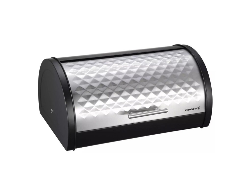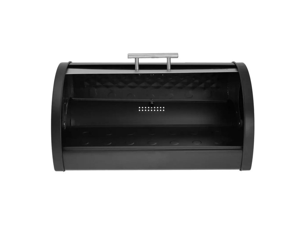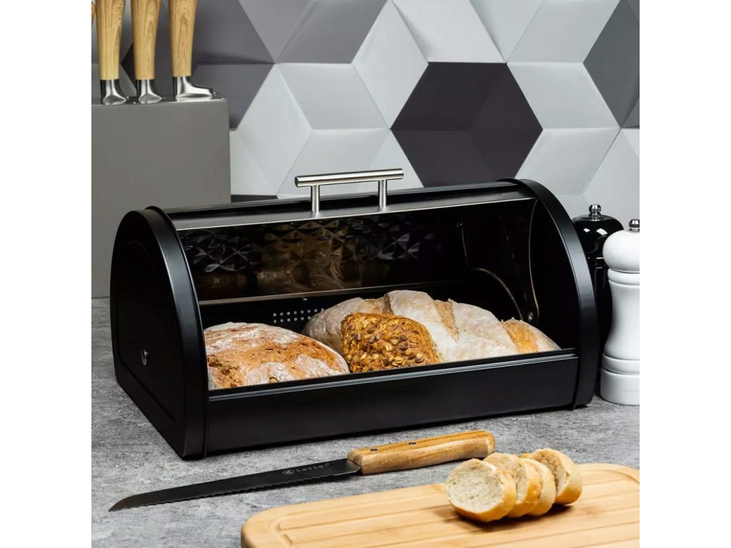 Stylová nerezová chlebovka s černým tělem a stříbrným víkem, která ozdobí každou kuchyni a zároveň udržuje čerstvost pečiva. Rolovací víko se hladce otevírá a zavírá pro snadné použití.