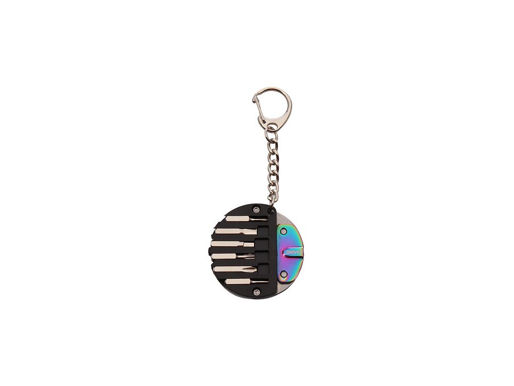 Praktický přívěsek na klíče se šroubovákem se 6 bity a malou vyklápěcí ocelovou čepelí.