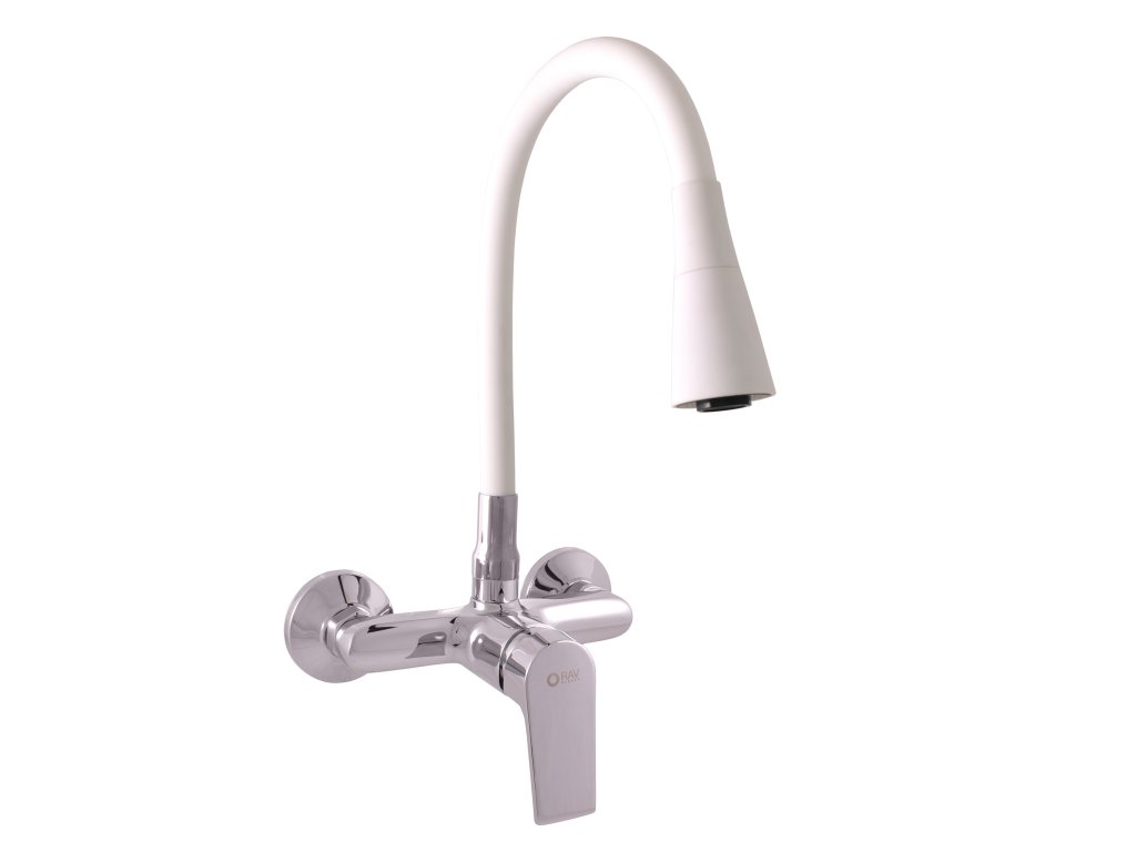 Vodovodní baterie dřezová nástěnná s flexibilním otočným ramínkem se sprchou.