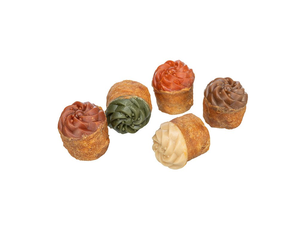 hnědý - mouka ze sladkých brambor, kuřecí prsa 15 %, hrachová mouka, glycerin, karobová mouka, dýně, kvasnice, minerály
