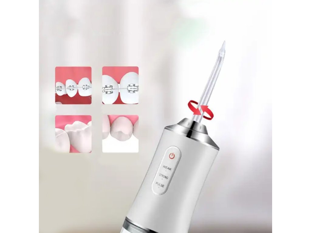 Akumulátorový zubní irigátor používaný k důkladnému čištění zubů pomocí silného proudu vody. Výrobek se doporučuje zejména lidem s nadměrným zubním kamenem, zubními protézami nebo ortodontickými aparáty. Rozhodně usnadňuje péči o vaši ústní hygienu a účinně doplňuje standardní čištění zubů. Vybaven až 3 provozními režimy (normální, silný a pulzující) a až 8 různými hroty (2 od každého typu). Lehký a kompaktní design a vestavěná baterie (nabíjená pomocí přiloženého USB kabelu) vám umožní vzít si zařízení na cesty.
