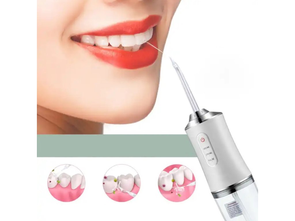 - Akumulátorový dentální irigátor používaný k důkladnému čištění zubů pomocí silného proudu vody.