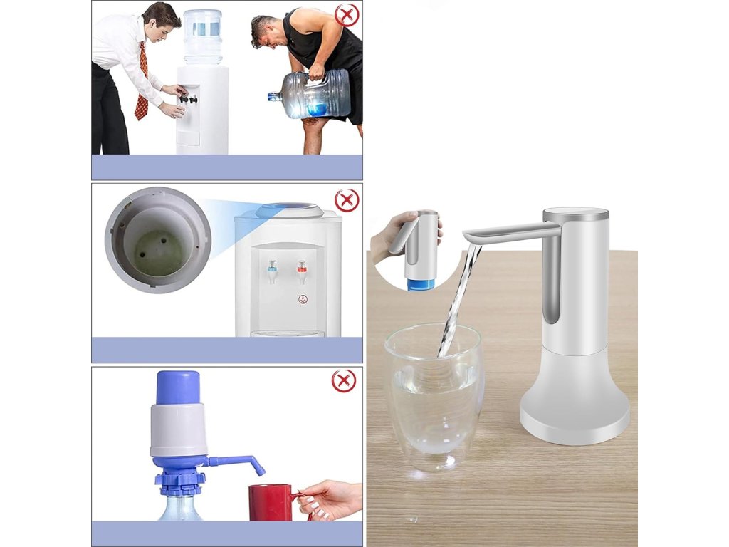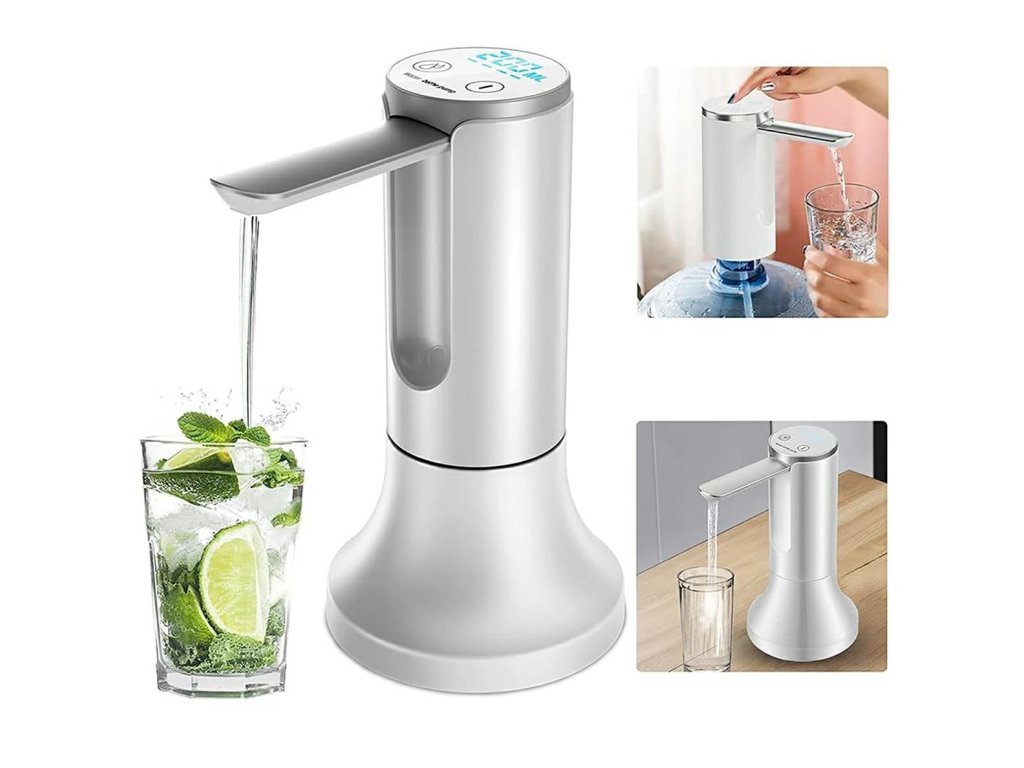 Elektrické vodní čerpadlo. Umožňuje přelévat vodu z velkých a objemných lahví s velkou kapacitou do kompaktnějších lahví nebo nádob. Nevyžaduje napájení ze sítě (vestavěná baterie se nabíjí přes standardní USB port). Díky kompaktním rozměrům se dávkovač snadno připevní k hrdlu lahve. Ocelová trubice je skládací, což usnadňuje přepravu a nalévání vody do sklenic. Dlouhá sací trubice a vysoká účinnost urychlují čerpání. Zařízení má 3 předdefinované provozní režimy, které vám umožňují dávkovat 200/400 nebo 800 ml vody jedním kliknutím.