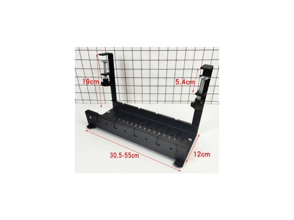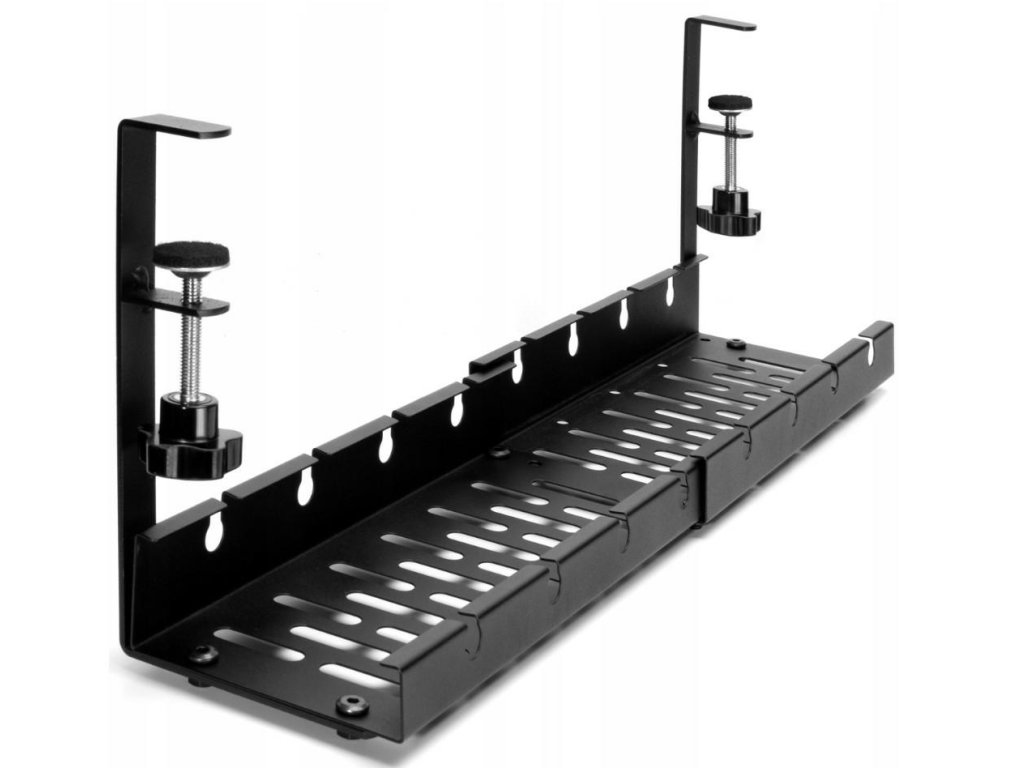 Nastavitelná závěsná police - organizér kabelů - určená k zavěšení pod stůl. Možnost nastavení šířky usnadní přizpůsobení potřebám uživatele. Vybaveno pevnými montážními držáky, přišroubovanými k pracovní desce (neinvazivní instalace). Organizér má v základně větrací otvory, které brání zahřívání pásků a kabelů. Speciální výřezy na přední a zadní straně usnadňují vedení kabelů. Vyrobeno z masivní nerezové oceli (s práškovým nástřikem), která zajišťuje dlouhé používání.