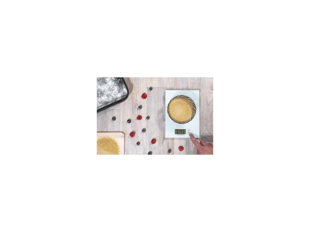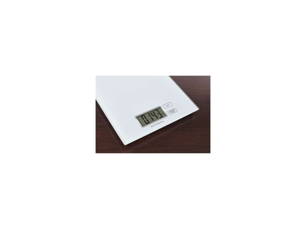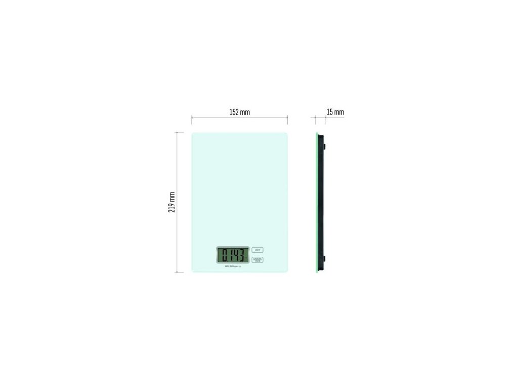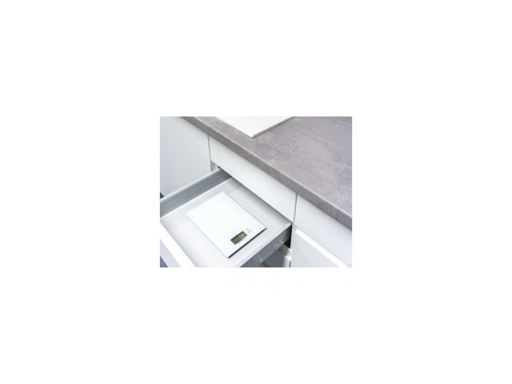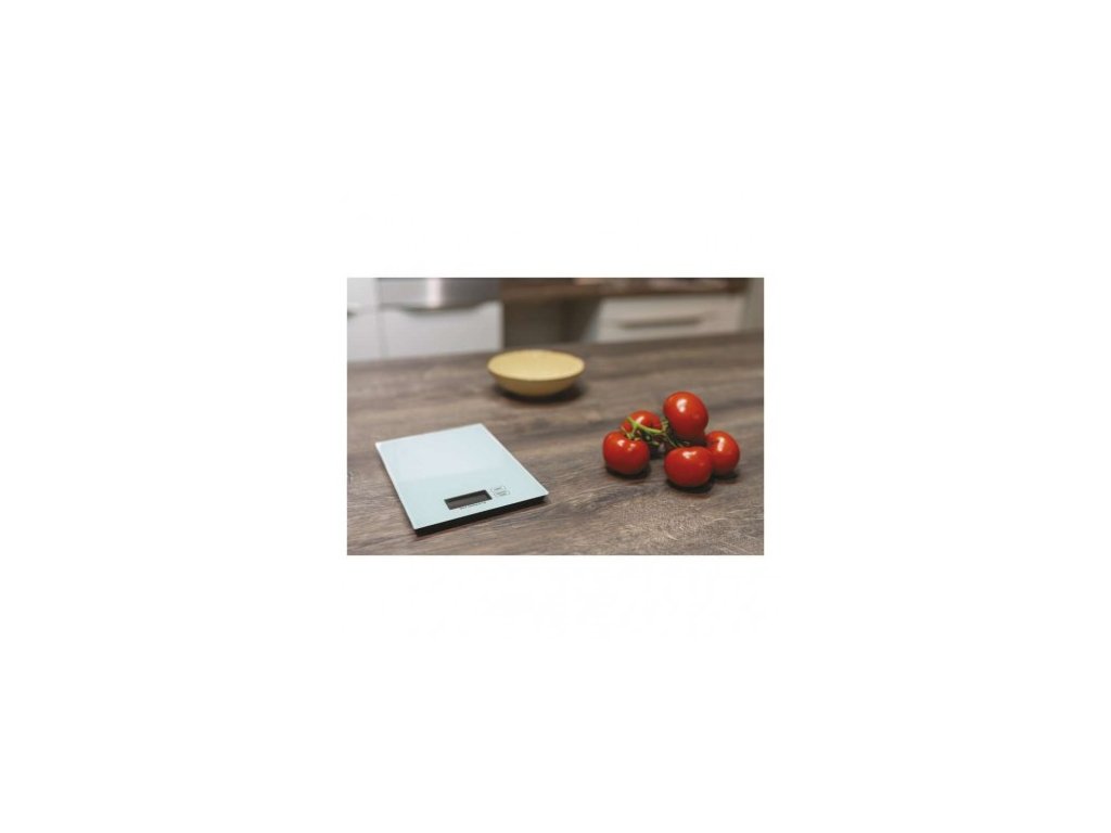 automatické vypnutí: po 2 minutách|barva: bílá|Bluetooth: ne|BMI index – měření tuku, vody a svalové hmoty: ne|funkce dovažování: ano|indikace slabých baterií: ano|indikátor přetížení: ano|jednotky váhy: g, oz, lb, kg|LCD displej: ano|max. zátěž: 5 kg|napájení: 1× 3 V CR2032 (součástí balení)|paměť: ne|podsvícený displej: ne|povrch váhy: tvrzené sklo|přesnost vážení: 1 g|prodejní obal: 1 ks, krabička|produkt: kuchyňská váha|rozměr: 15 × 152 × 219 mm