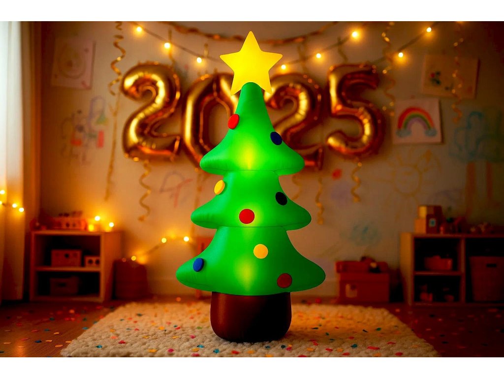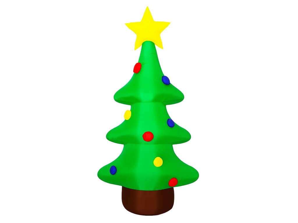 Tento nafukovací vánoční stromeček s barevnými ozdobami a žlutou hvězdou na vrcholu je výraznou sváteční dekorací do zahrady, domu nebo obchodu. Vestavěné LED osvětlení vyzařuje příjemné světlo a vytváří teplou a radostnou atmosféru. Snadno se sestavuje a skladuje, takže se stane skvělým ústředním bodem každé vánoční výzdoby. Součástí je 2metrový kabel, 2 uzemňovací kolíky, 2 úchyty a 12V foukací zařízení. Výška: přibližně 125 cm.