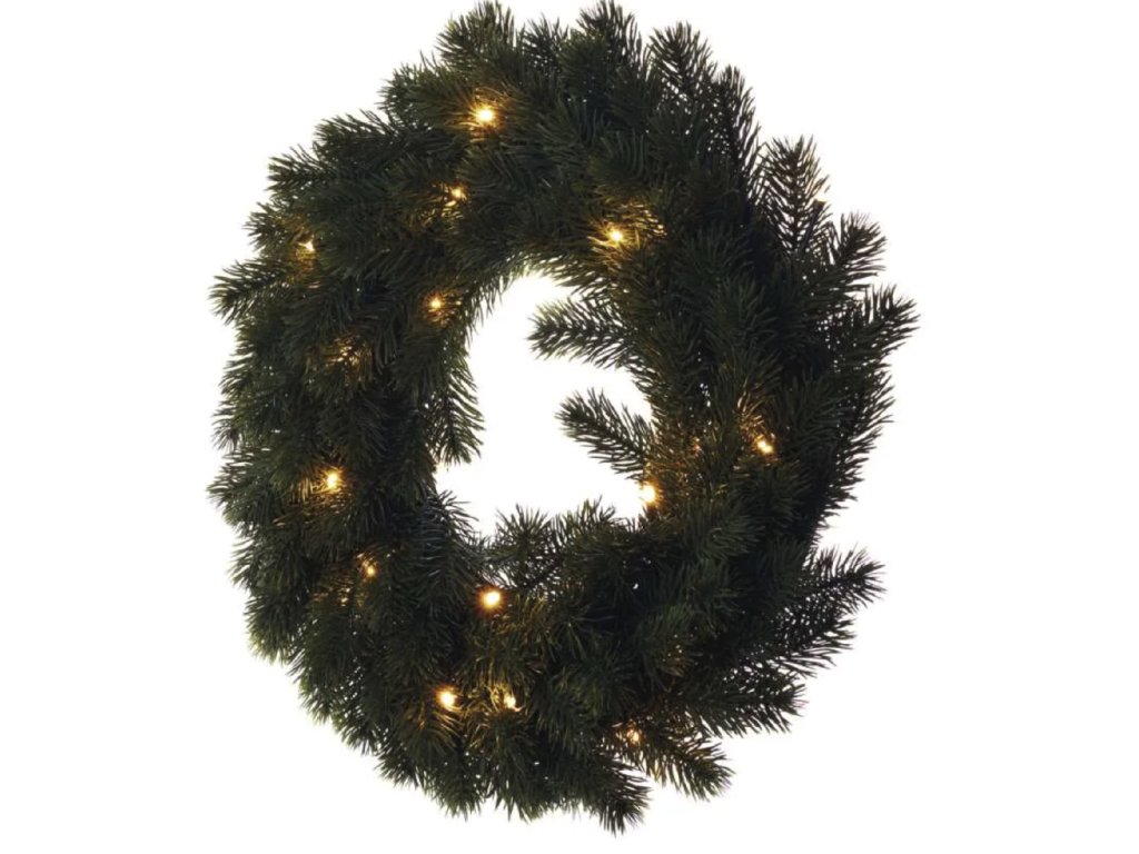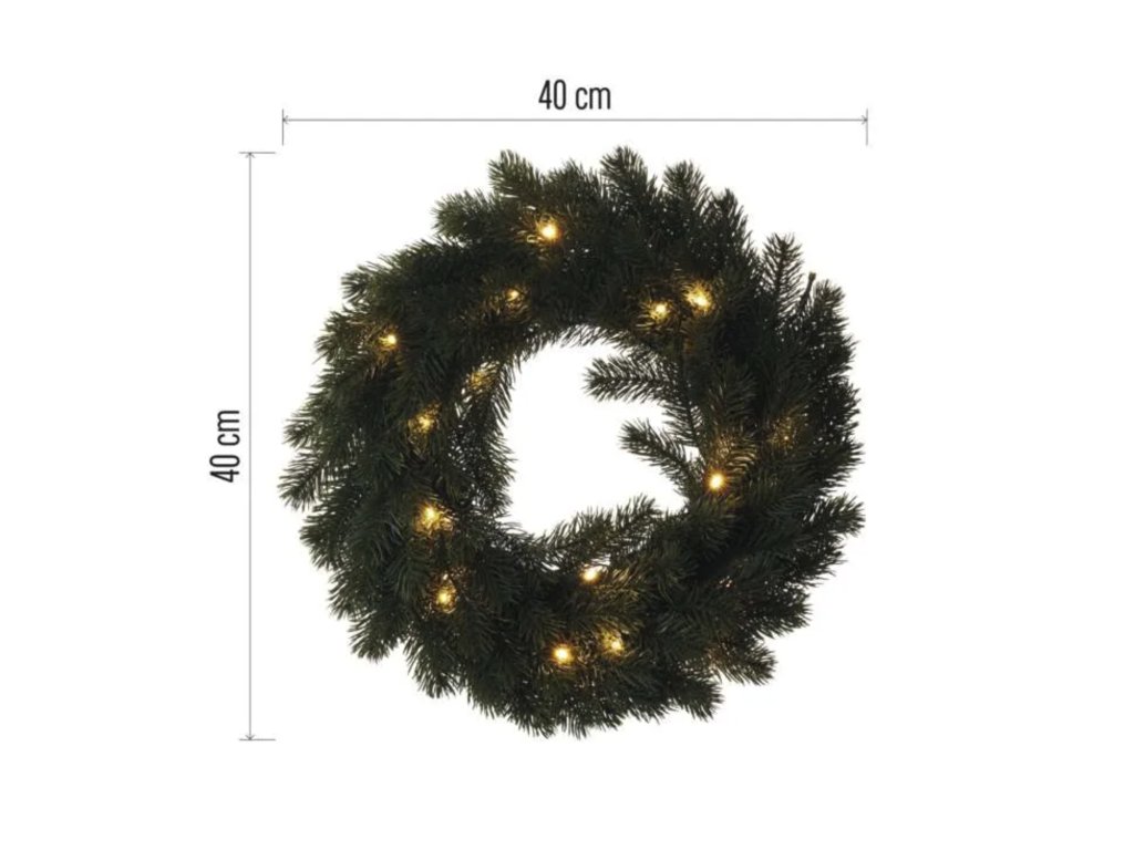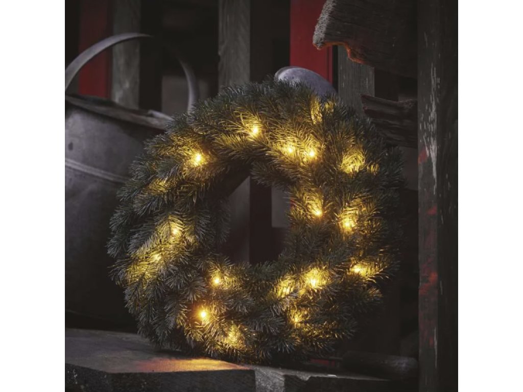Pro dokonalou vánoční atmosféru je věnec doplněn drobnými LED světýlky s teplým bílým světlem, napájenými AA bateriemi.
