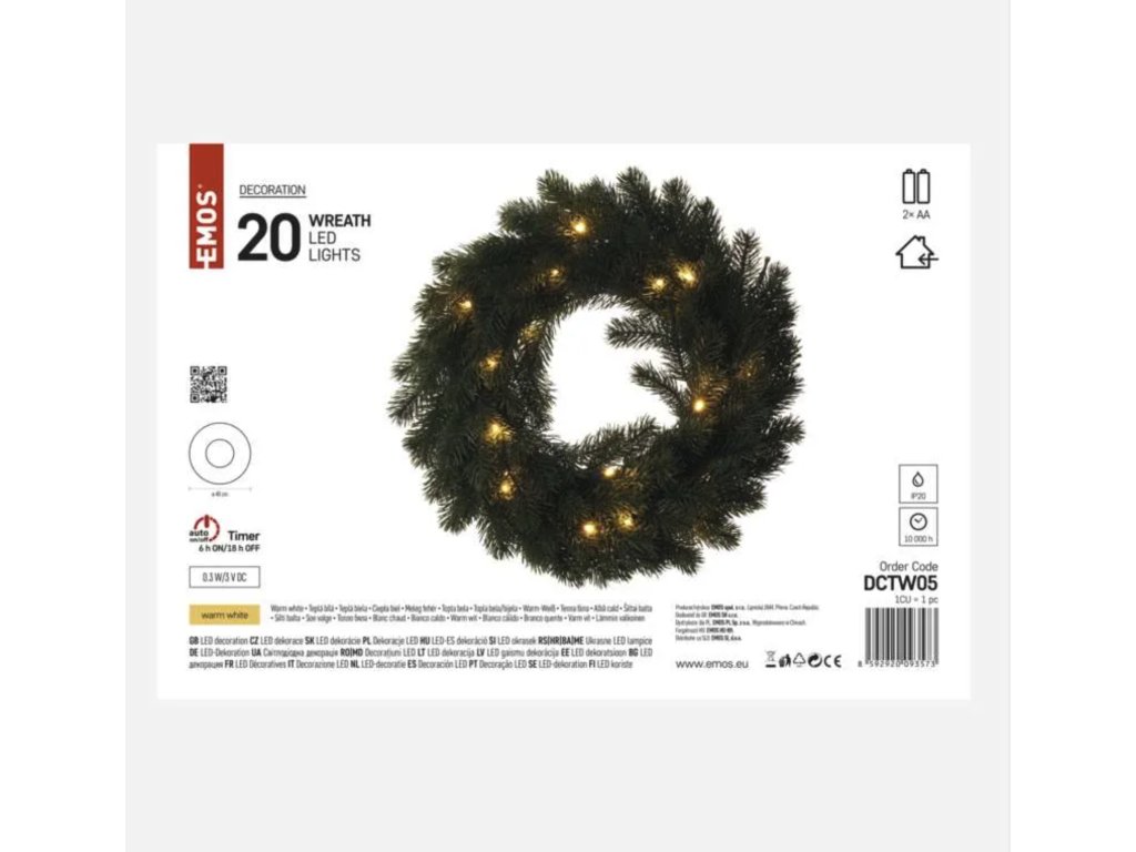 EMOS DCTW05 LED vánoční věnec, 40 cm, 2x AA, vnitřní, teplá bílá, časovač Vánoční dekorace