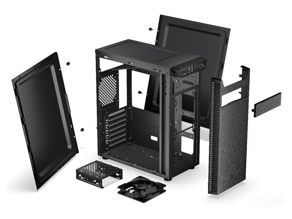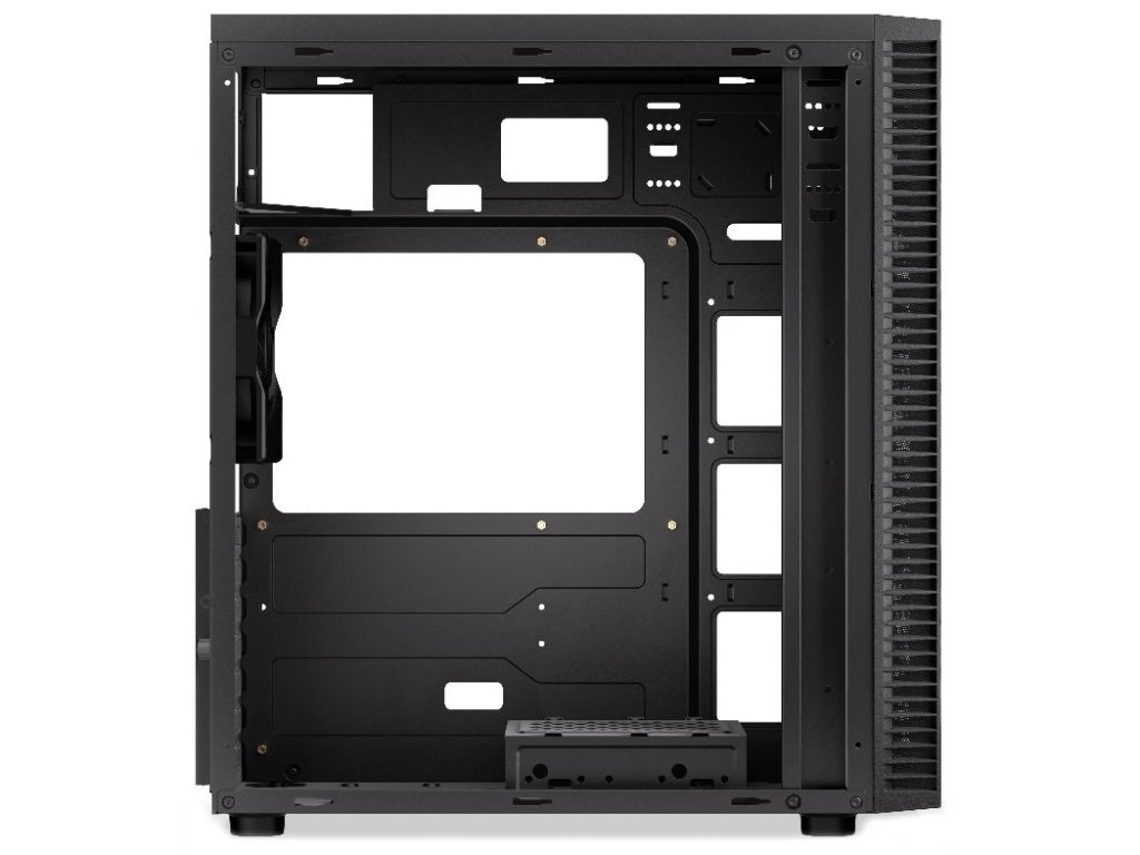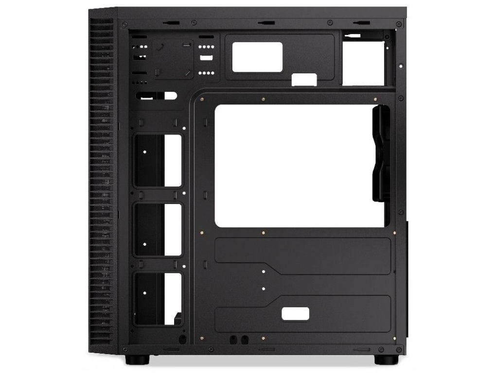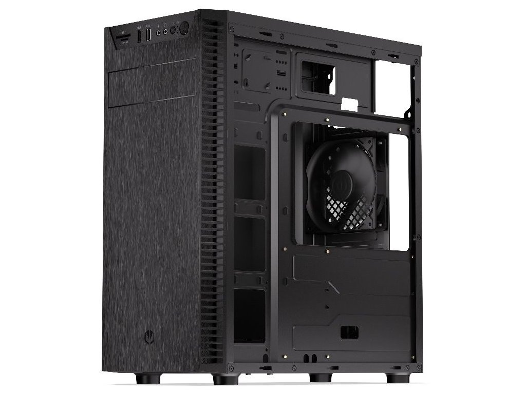 Skříň formátu Middle Tower nabízí čtyři 2,5", jednu 3,5", jednu kombinovanou 2,5"/3,5" pozici pro pevné disky a dvě 5,25" pozice, z nichž jedna je externě přístupná. Na přední části se nachází dva USB 3.0 porty, sluchátkový výstup, audio vstup pro mikrofon a čtečka microSD a SD paměťových karet. Vybavena je jedním 120mm ventilátorem na zadní straně, který zajišťuje dostatečné proudění vzduchu. Důmyslné řešení umožňuje pohodlné umístění až 240 mm dlouhého výměníku vodního chlazení na přední straně. Ve skříni je dostatek prostoru pro chladič CPU do výšky až 165 mm a grafickou kartu o délce až 335 mm. Dodávána je bez zdroje.