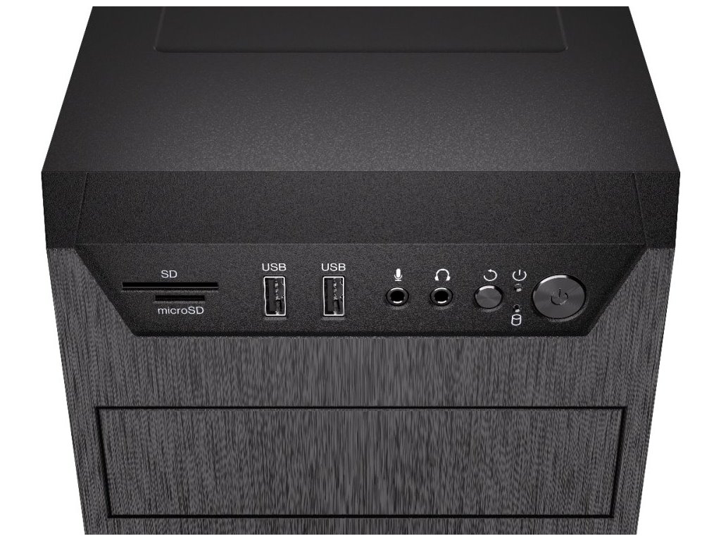 Konektory na předním panelu: 2× USB 3.2 Gen1 (USB 3.0), 1× sluchátkový výstup, 1× vstup pro mikrofon, 1× čtečka SD karet, 1× čtečka microSD karet
