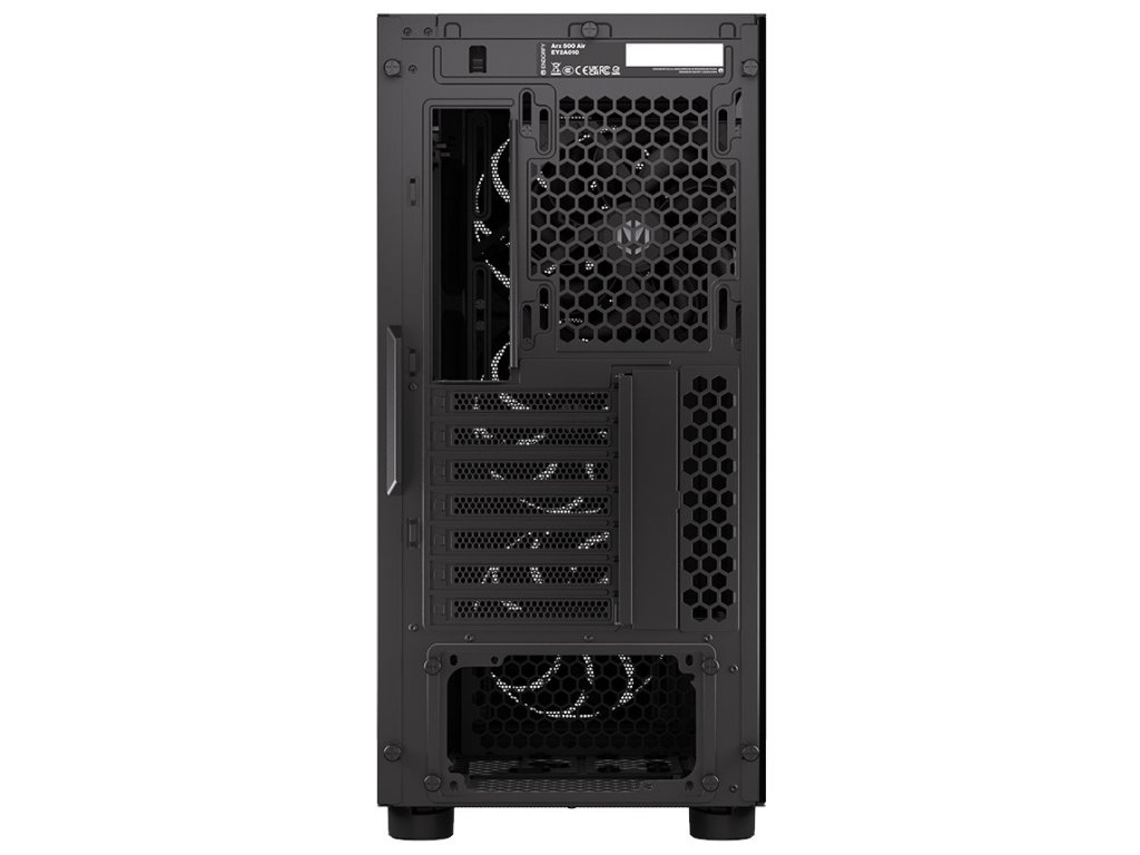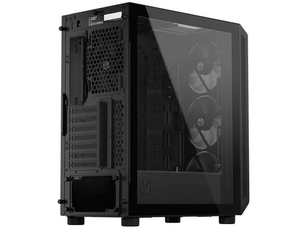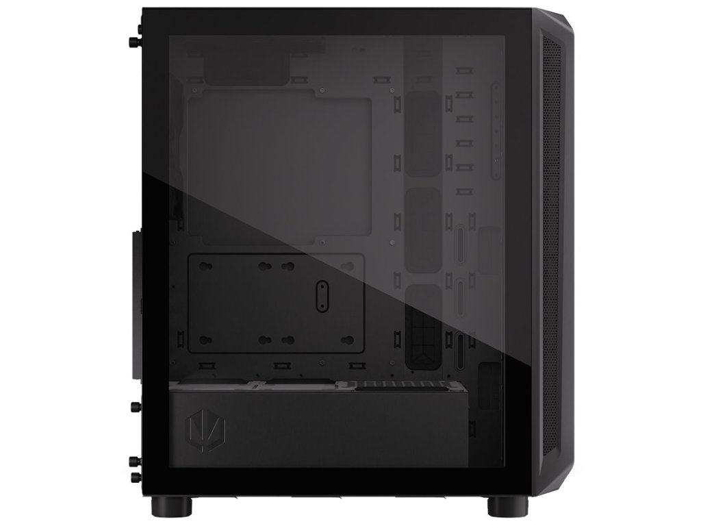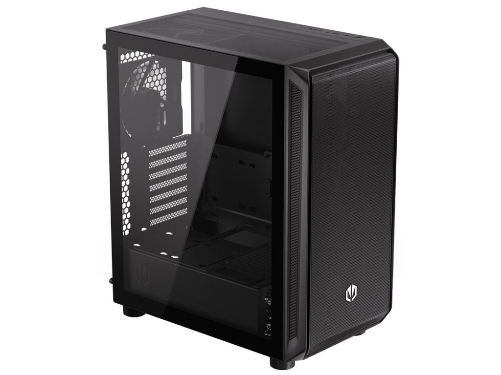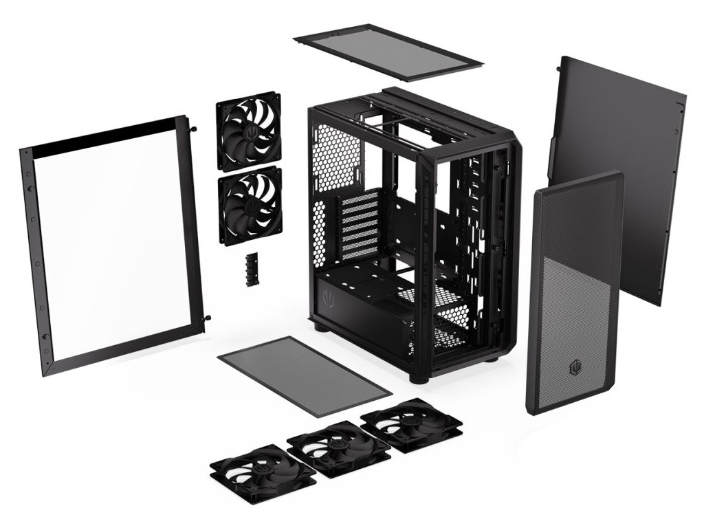 Skříň formátu Middle Tower s průhlednou bočnicí nabízí šest 2,5" pozic pro SSD disky a jednu 3,5" pozici pro pevný disk. Na horním panelu naleznete dva porty USB 3.0, jeden port USB-C a dále také konektor pro sluchátka a konektor pro mikrofon. Skříň je osazena pěti ventilátory o velikosti 140 mm. Důmyslné řešení umožňuje pohodlné umístění až 360 mm dlouhého výměníku vodního chlazení na přední straně. Ve skříni je dostatek prostoru pro chladič CPU do výšky až 179 mm a grafickou kartu o délce 350 mm. Skříň je dodávána bez zdroje. Součástí je také sada prachových filtrů.