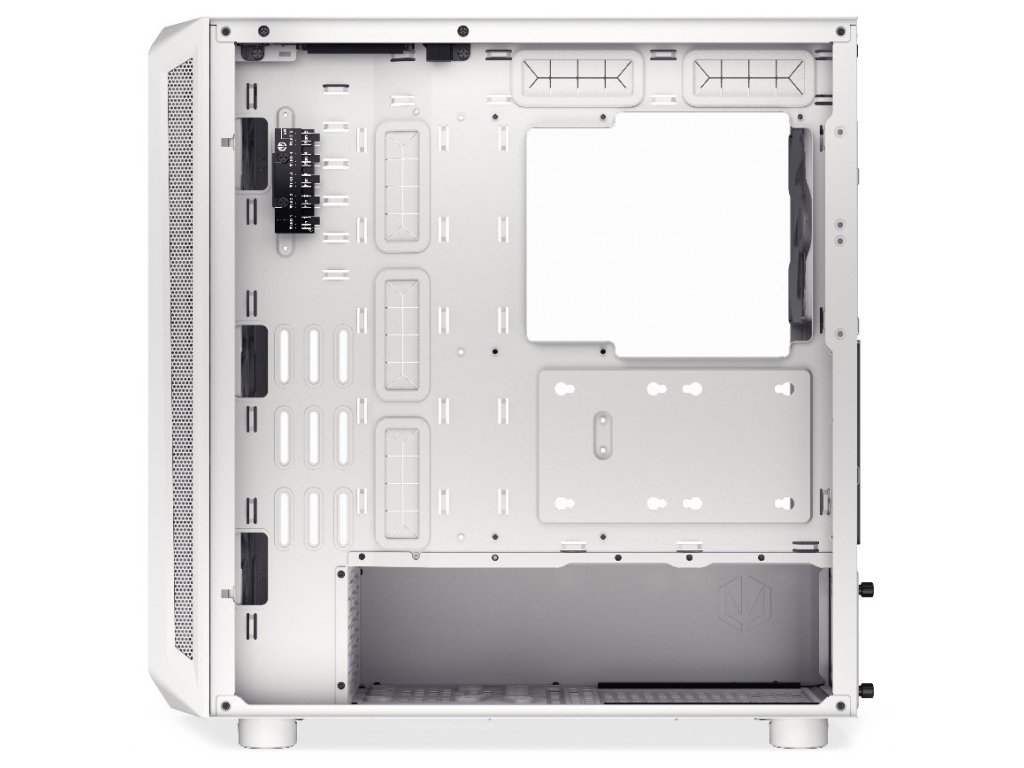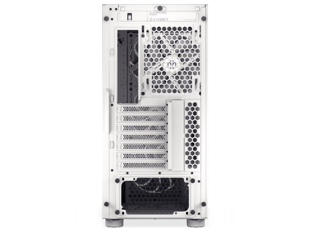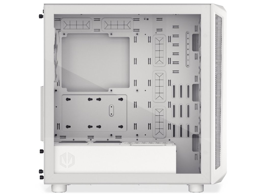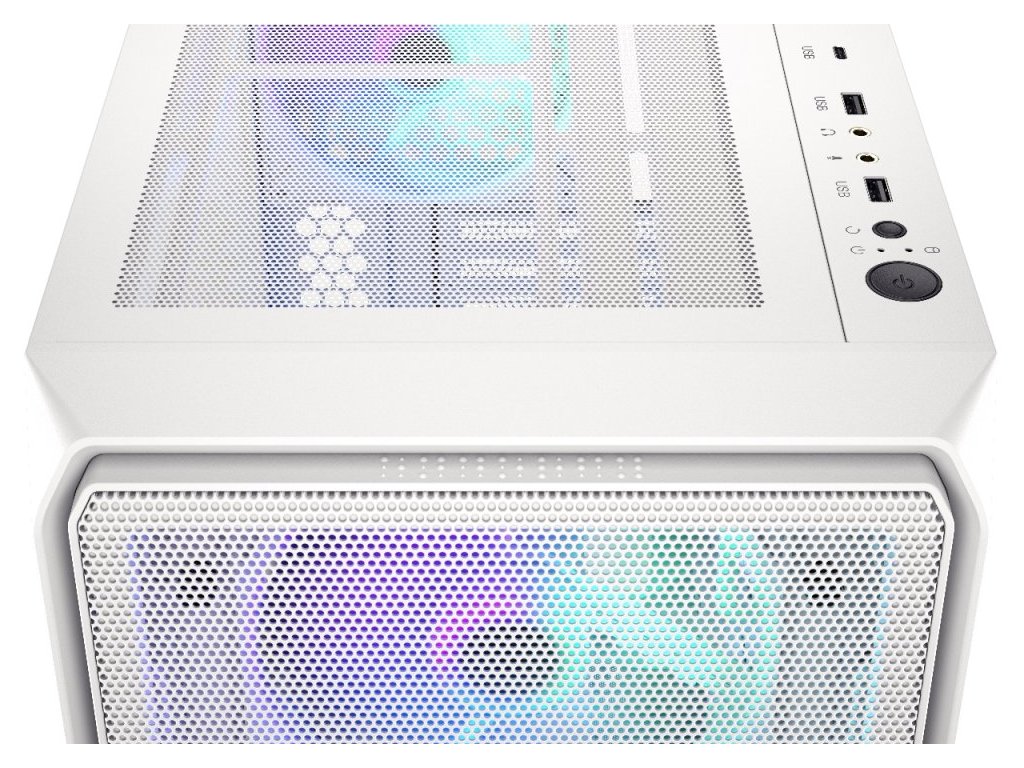 Skříň formátu Middle Tower s průhlednou bočnicí nabízí šest 2,5" pozic pro SSD disky a jednu 3,5" pozici pro pevný disk. Na horním panelu naleznete dva porty USB 3.0, jeden port USB-C a dále také konektor pro sluchátka a konektor pro mikrofon. Skříň je osazena čtyřmi ventilátory o velikosti 140 mm s ARGB podsvícením. Důmyslné řešení umožňuje pohodlné umístění až 360 mm dlouhého výměníku vodního chlazení na přední a horní straně. Ve skříni je dostatek prostoru pro chladič CPU do výšky až 179 mm a grafickou kartu o délce 410 mm. Skříň je dodávána bez zdroje. Součástí je také sada prachových filtrů.