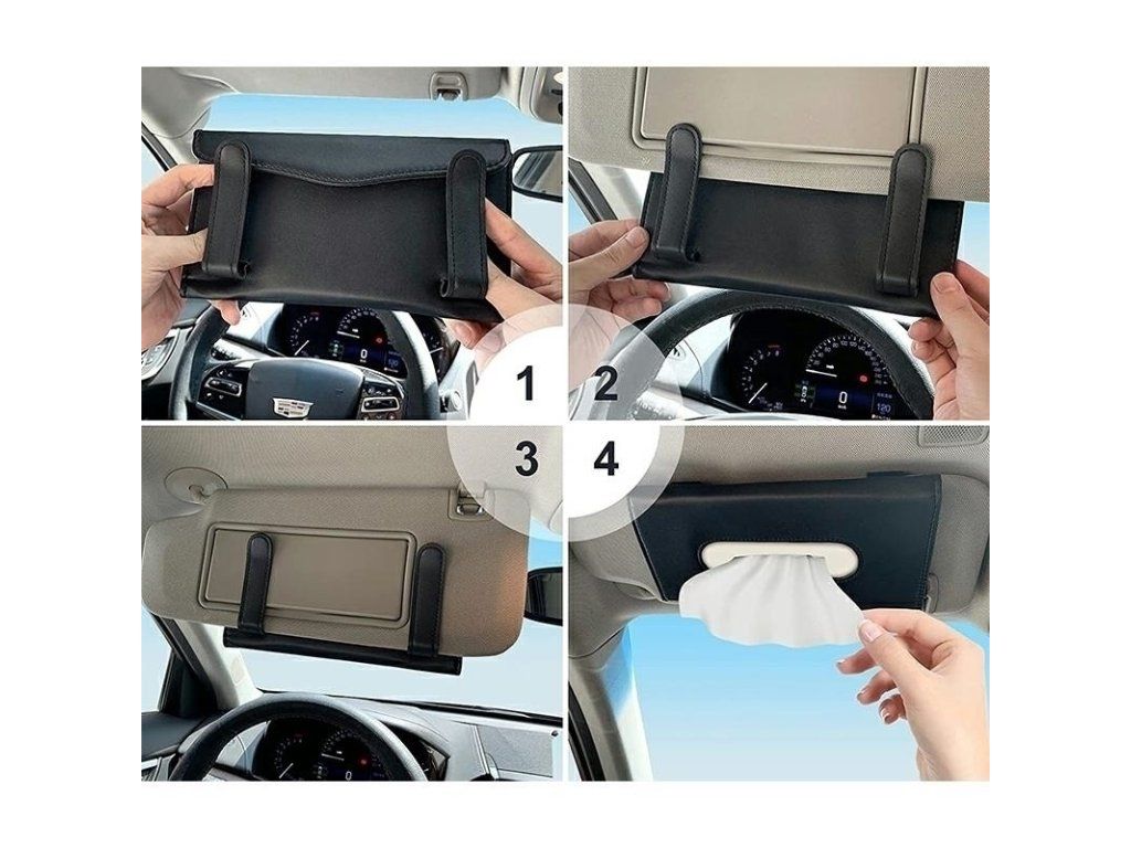 Potah se zavěšuje na sluneční clonu - pasuje na většinu osobních i nákladních automobilů. Specifikace: rozměry: 23x12x2,5cm materiál: PU kůže