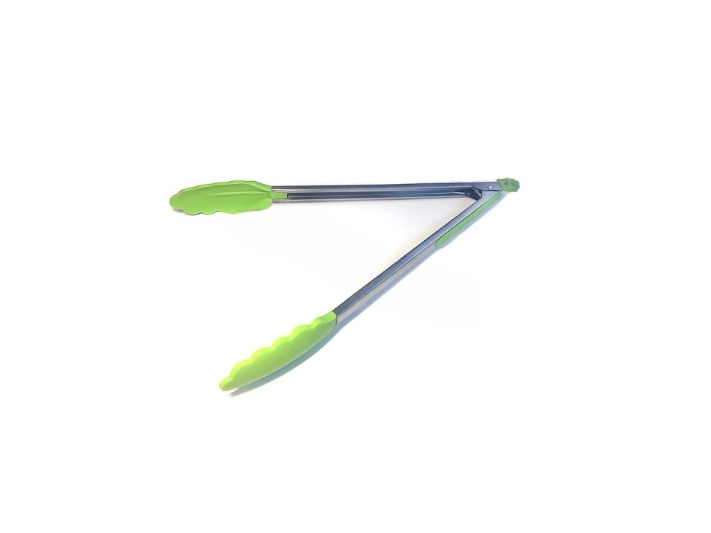 Grilovaci kleště z nerezové oceli se světle zelenou sikonovou pracovní plochou. Bezpečné a komfortní použití díky silikonovému držadlu.