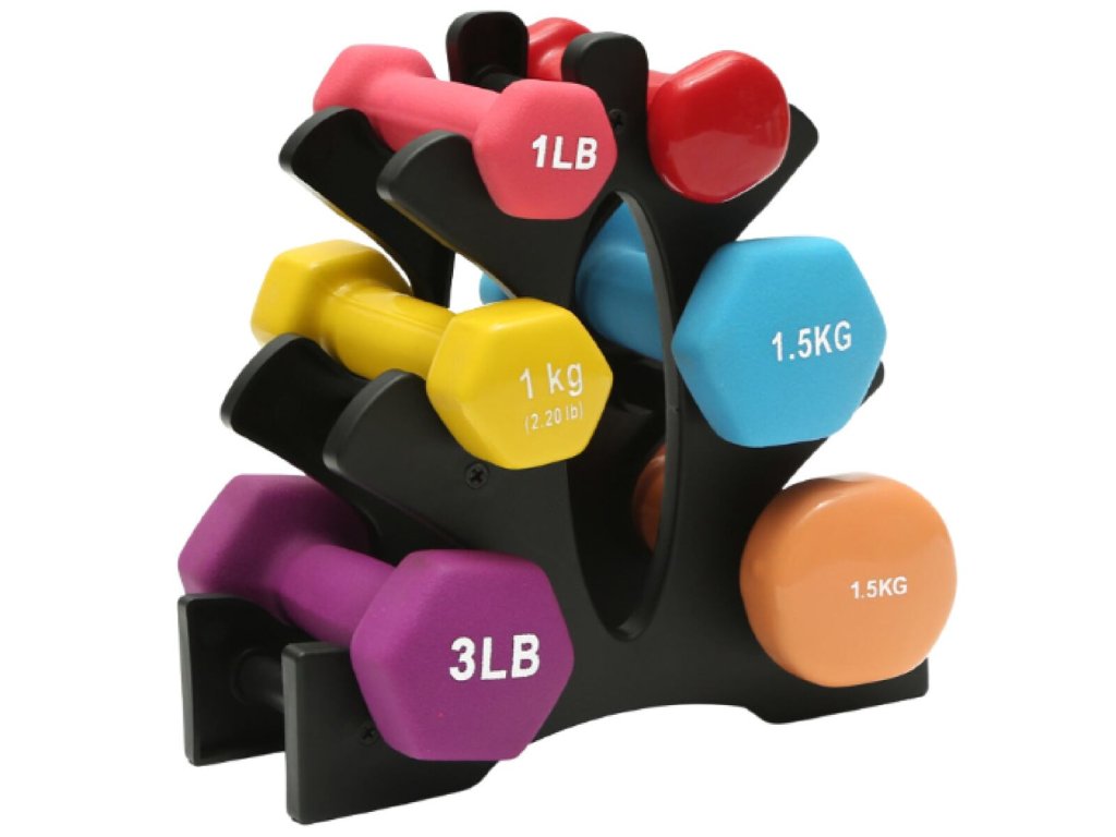 Skládací PVC stojánek pro šest jednoručních činek. Rozměry 23 x 23 x 9 cm.