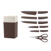 Sada kuchyňských nožů z nerezové oceli je vyrobena v elegantní hnědé barvě a je tak nejen praktickým doplňkem každé kuchyně. Nože jsou uloženy ve stojanu ve stejném provedení. Šetříte tak místo a víte, že máte ten správný nůž vždy po ruce.