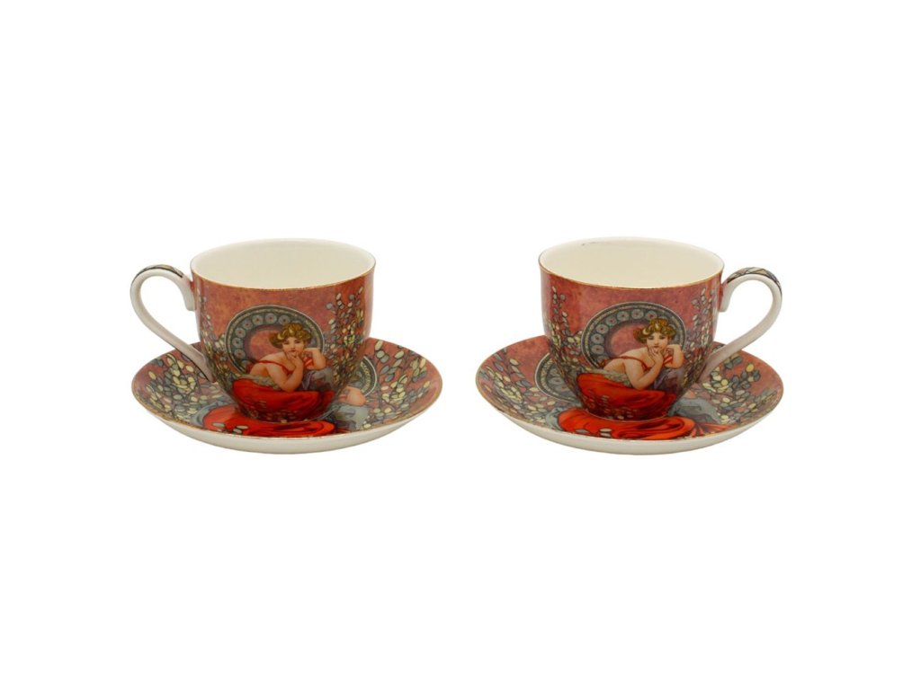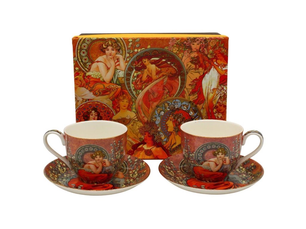 Elegantní, vysoce kvalitní tenký porcelánový set s fascinujícím replikou díla slavného českého malíře Alfonse Muchy. Sada se skládá ze dvou porcelánových šálků a podšálků a je zabalena v dárkové krabičce.