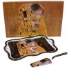 Motiv obrazu slavného malíře Gustava Klimta Polibek zdobí porcelánový servírovací podnos s lopatkou. Krásný dekor pro radost všech, kteří mají rádi jeho dílo. Servírování cukroví, dezertů či chlebíčků bude luxusní i snadné. Podnos má po stranách úchyty pro bezpečné přenášení.