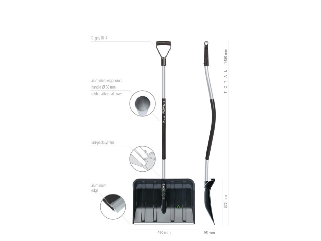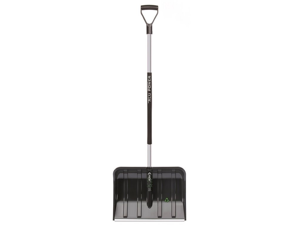 Hrablo z kvalitního plastu a kovu, hliníková hrana pro snazší nabírání sněhu, odolnost vůči teplotám do -18 °C. Pogumovaná část násady pro pohodlný a bezpečný úchop. Černá barva.
