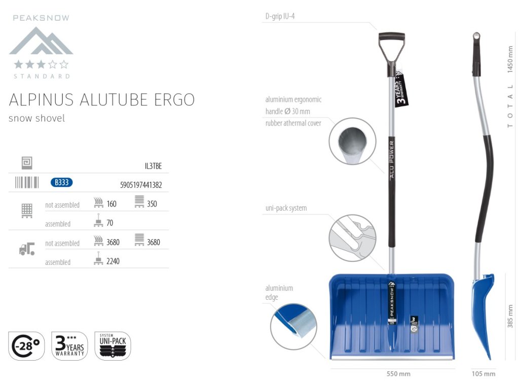 Hrablo z kvalitního plastu a kovu, hliníková hrana pro snazší nabírání sněhu, odolnost vůči teplotám do -28 °C. Ergonomická násada s pogumovanou částí pro pohodlný a bezpečný úchop. Modrá barva.
