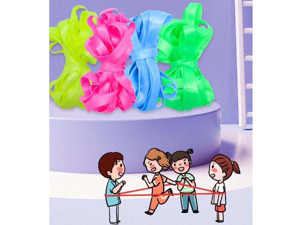 Sada čtyř gum na skákání. Jednoduchá pomůcka pro rozvoj rovnováhy, rytmu a týmové spolupráce u dětí.