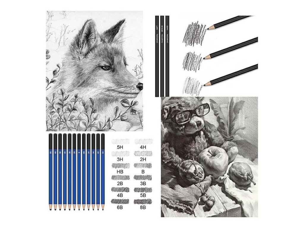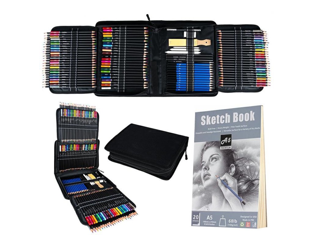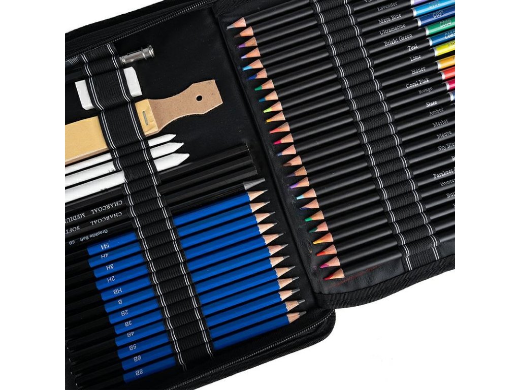 Profesionální kreslicí sada balená v praktickém pouzdře. Počet kusů v sadě: 144 Obsahuje: 12 skicovacích tužek (8B, 6B, 5B, 4B, 3B, 2B, B, HB, 2H, 3H, 4H, 5H) 120 barevných tužek 3 uhlové tužky (měkké, střední, tvrdé) bezdřevou grafitovou tužku 6B 3 chomáčky oboustranný prodlužovač tužek ořezávátko brusný papír na tužky gumu 20stránkový skicář A5 Rozměry pouzdra: 21x29x6cm Produkt balen v další krabici - připraven k odeslání.